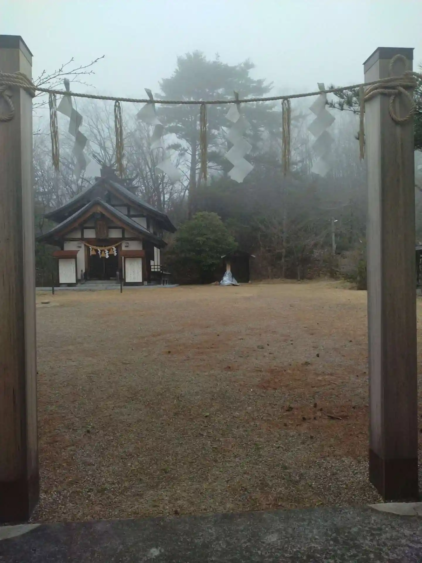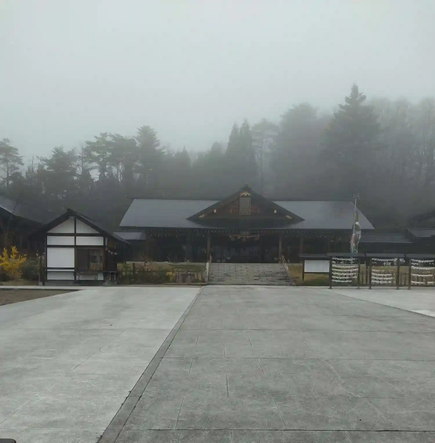 大國神社 境内からの御本殿の様子です(神秘な霧に包まれてました)