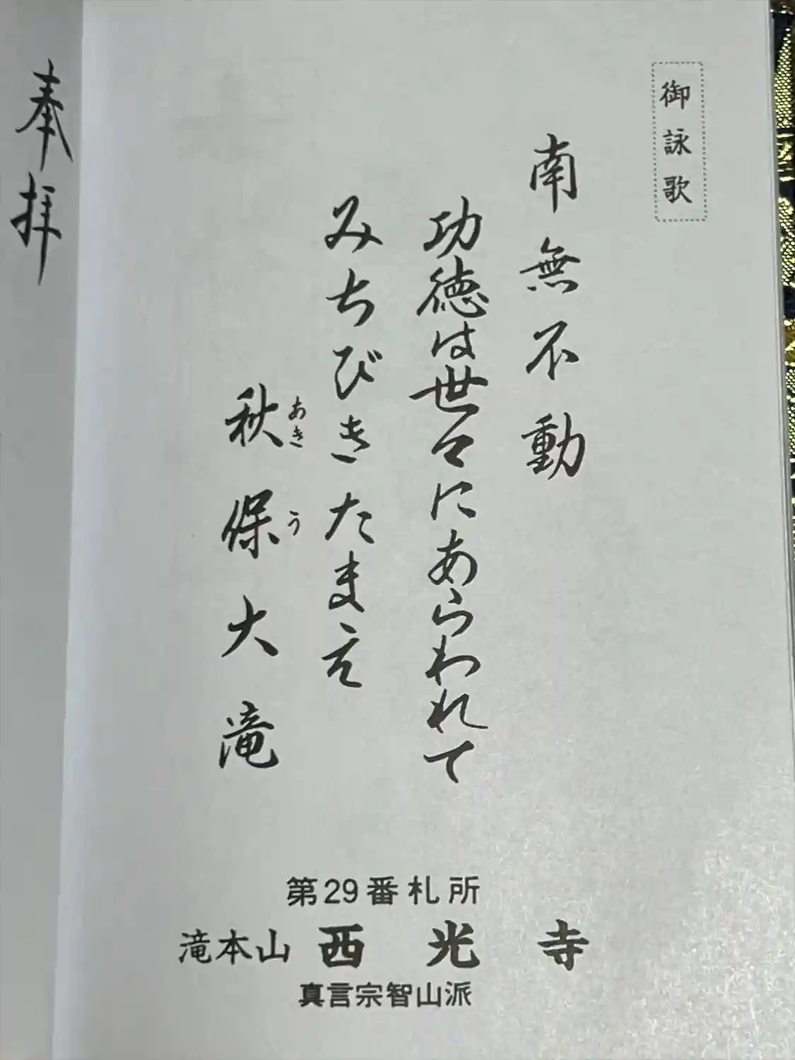 宮城県仙台市太白区に境内を構える、西光寺に霊場巡りにて伺いましたので、どの様な寺院か引用を用いて調べて見ました、山号は滝本山 、寺号は西光寺、宗派は真言宗智山派、ご本尊は大日如来、不動堂ご本尊は秋保大滝不動尊、不動明王、東北三十六不動尊霊場、第二十九番札所、東日本大震災慰霊、みちのく巡礼、宮城、第二十六番札所、秋保不動尊の縁起は平安時代初期に慈覚大師円仁(平安時代の高僧、第3代天台座主、入唐八家)が、現在の秋保温泉の温泉街にある磊々峡を霊地としてそれを望む高台(現在の塩滝不動尊)に大寺院を造営しようとしましたが、当地の領主がそれを拒否した為、山寺立石寺(山形県山形市)を開山しました。その後、円仁が当地を巡錫で訪れ秋保大滝を眺めたとき、比例なき霊地と定め、1体の不動明王を安置し山寺の奥の院とした事が始まりだとされます。不動明王(大滝不動明王坐像)は伊達家の鋳物師津田甚四郎の作と言われ、像高3.3m、面部1.2m、胴廻り5.1m、総重量4千貫あり金銅不動明王としては日本一大きいと言います、現在の西光寺御堂(不動堂)は江戸時代後期の文政8年(1825)に知足上人が再興したもので、木造平屋建て、三間四方(桁行3間、張間3間)、宝形造、銅板葺、向拝(一間)の建物です。江戸末期の社寺建築に見られる、複雑で繊細な彫刻が所狭しと見られ、内部の格天井には様々な絵が描かれ貴重な御堂建築の遺構である事から、名称「大滝不動堂」として平成7年(1995)に仙台市登録有形文化財(建造物)に登録、