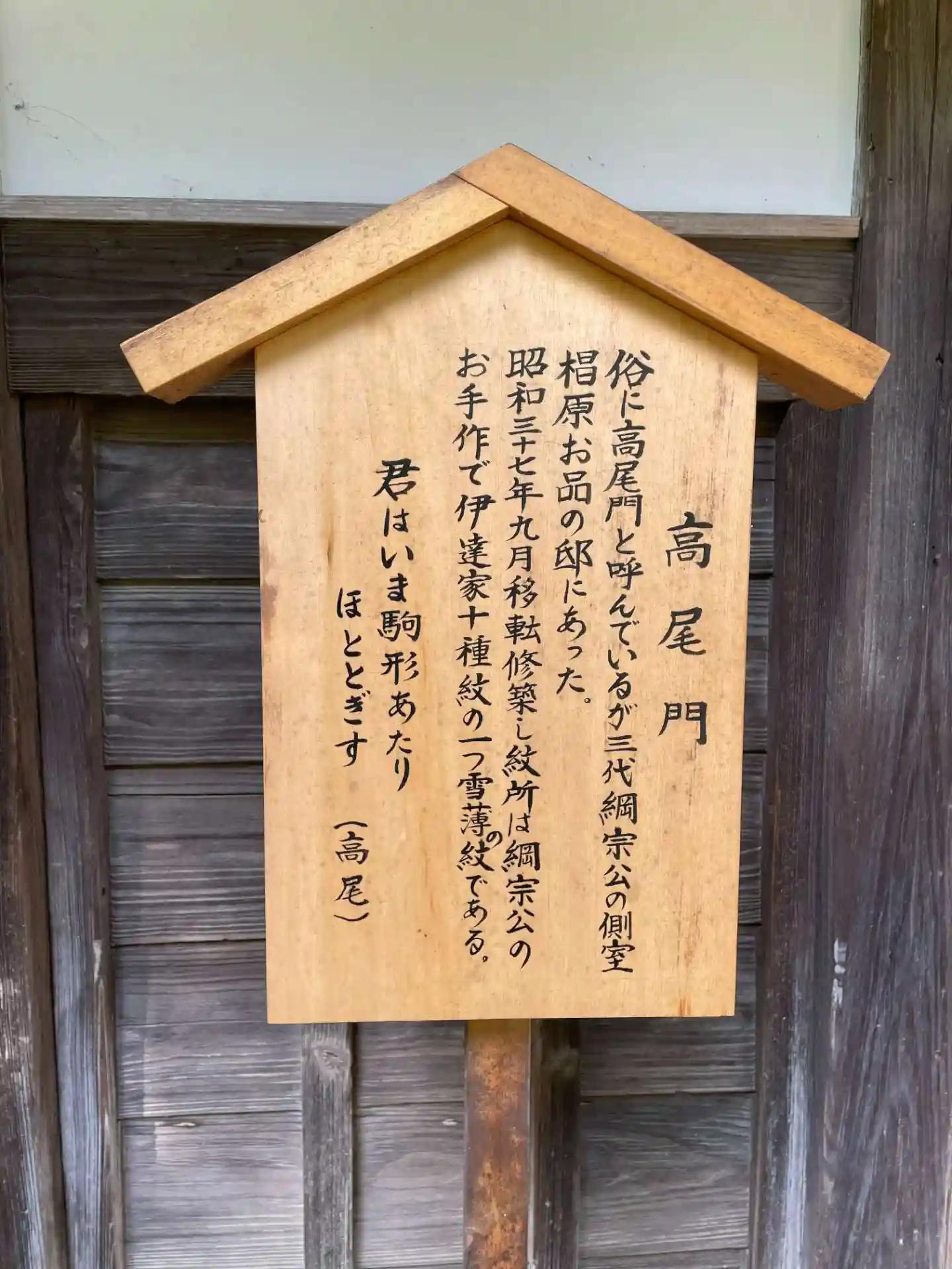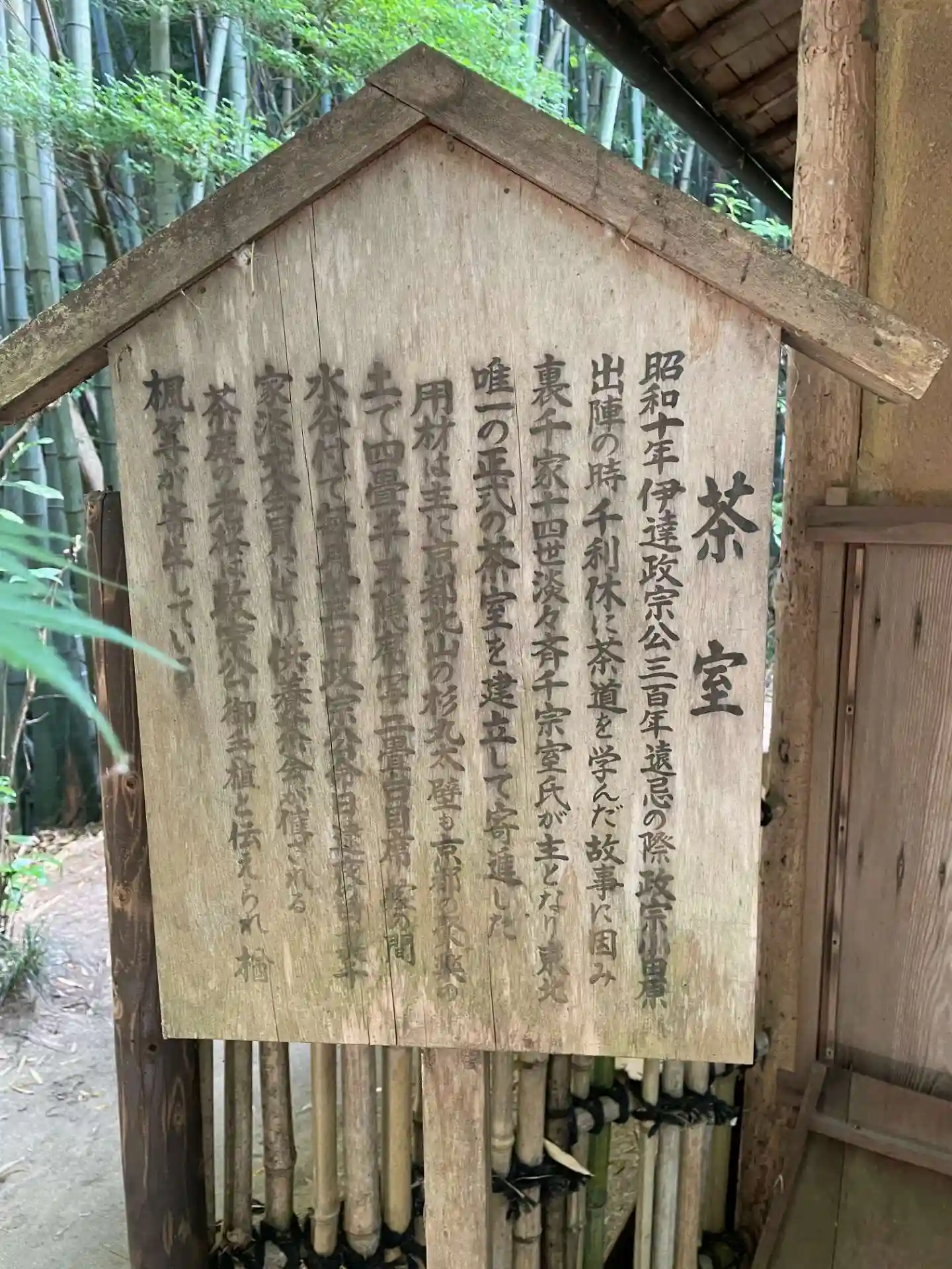 茶室へ続く門。三代藩主綱宗公の側室のお家にあったものを昭和に入って移築しました。