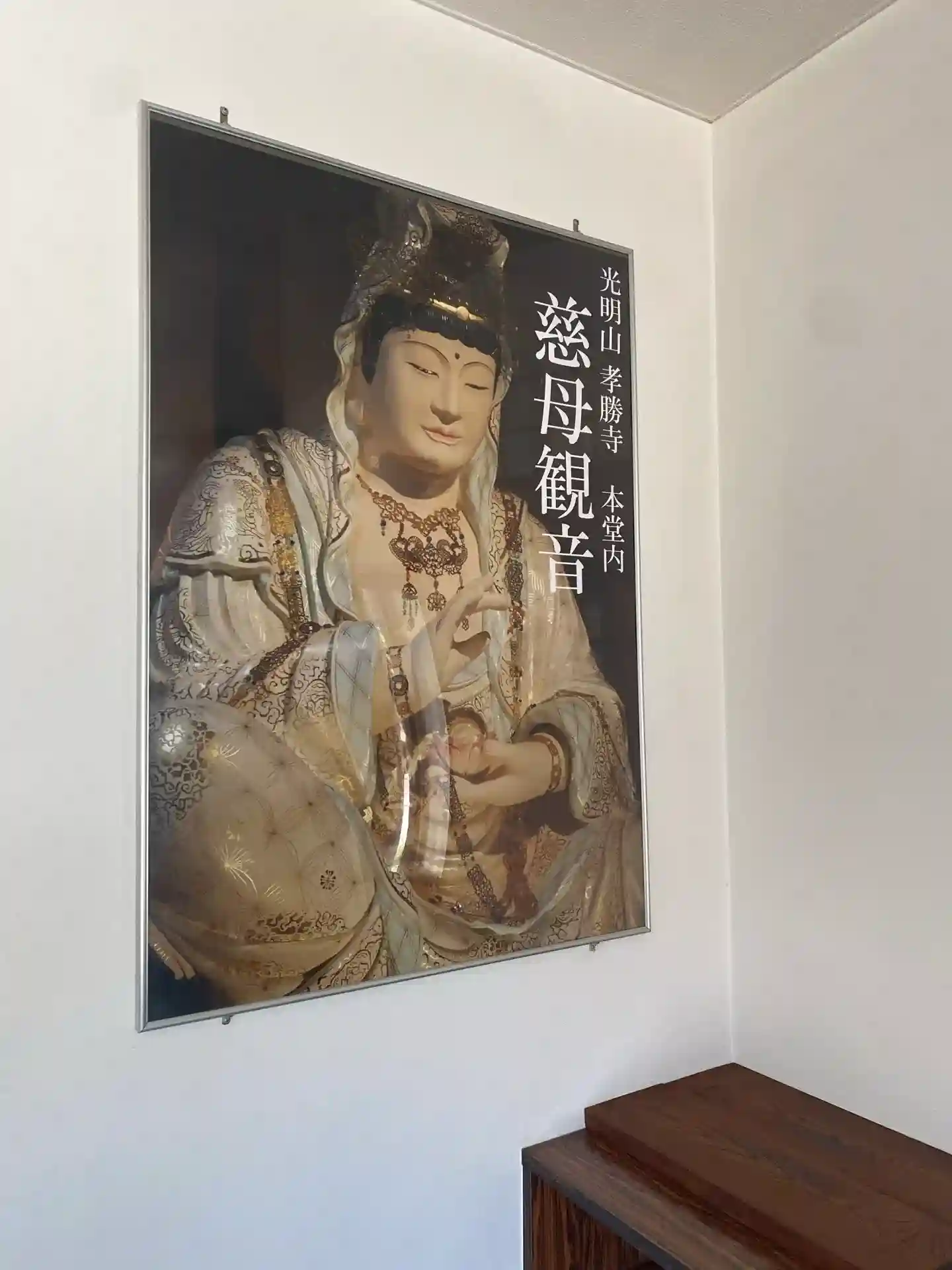 本堂を覗くととても輝いてる、ライトで照らされているような仏像があるように見えました。御朱印をお願いして玄関で待っていると慈母観音様のポスターがありました。とても気になり本堂にお参りさせていただきました。メガネをかけてよく見ると慈母観音様はとても綺麗です。ライトが当たっているわけでもなかったようです。光輝いているのです。