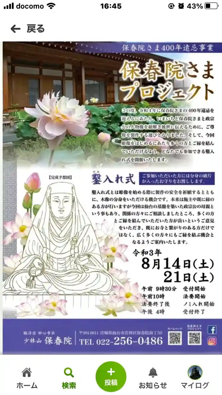 地元の新聞で、伊達政宗公御生母、保春院様のご仏像に、鑿入れが出来ると知りお伺いしました。
