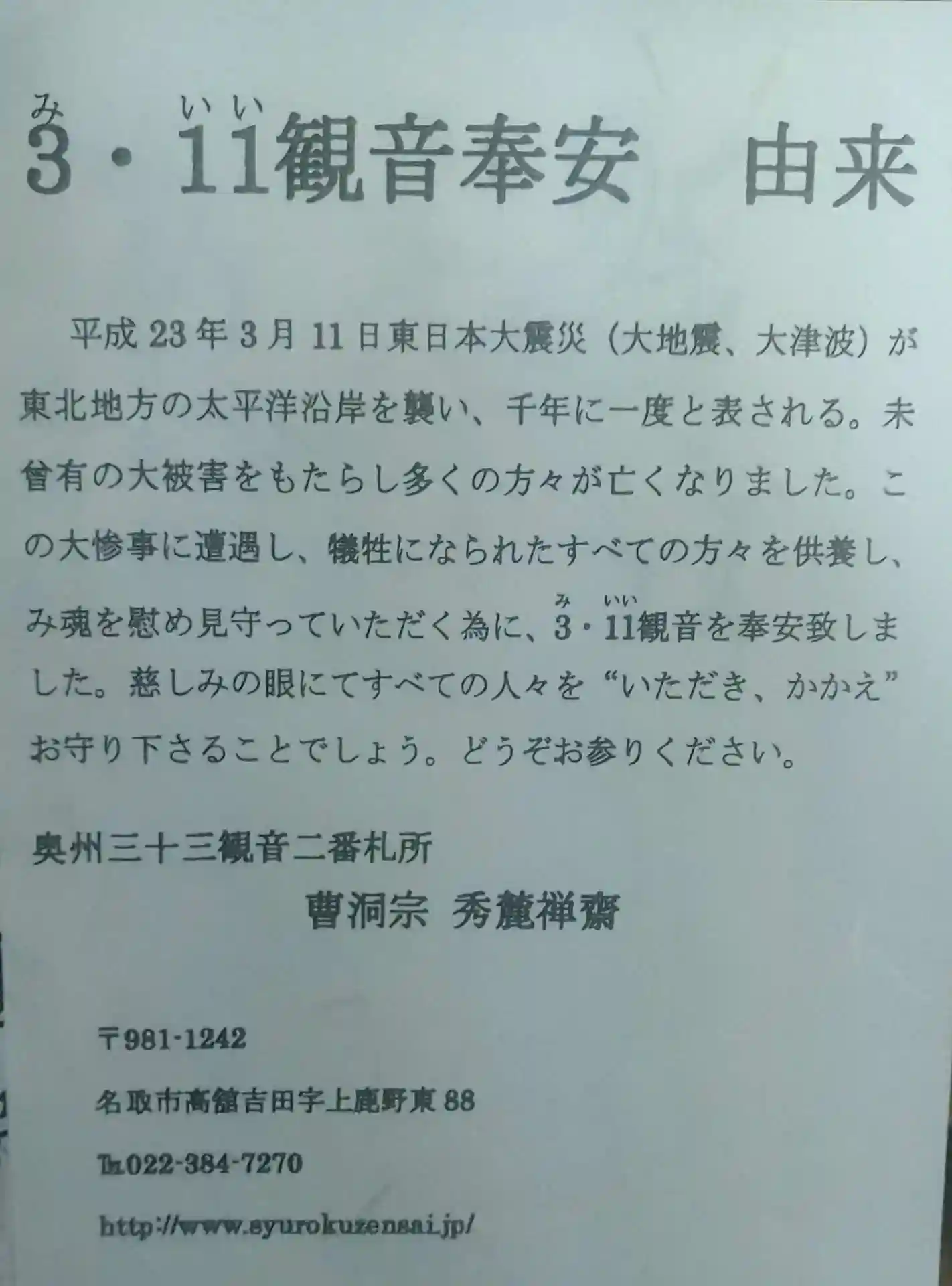 天苗山秀麗齊 3.11観音奉安由来について書かれたしおりです
