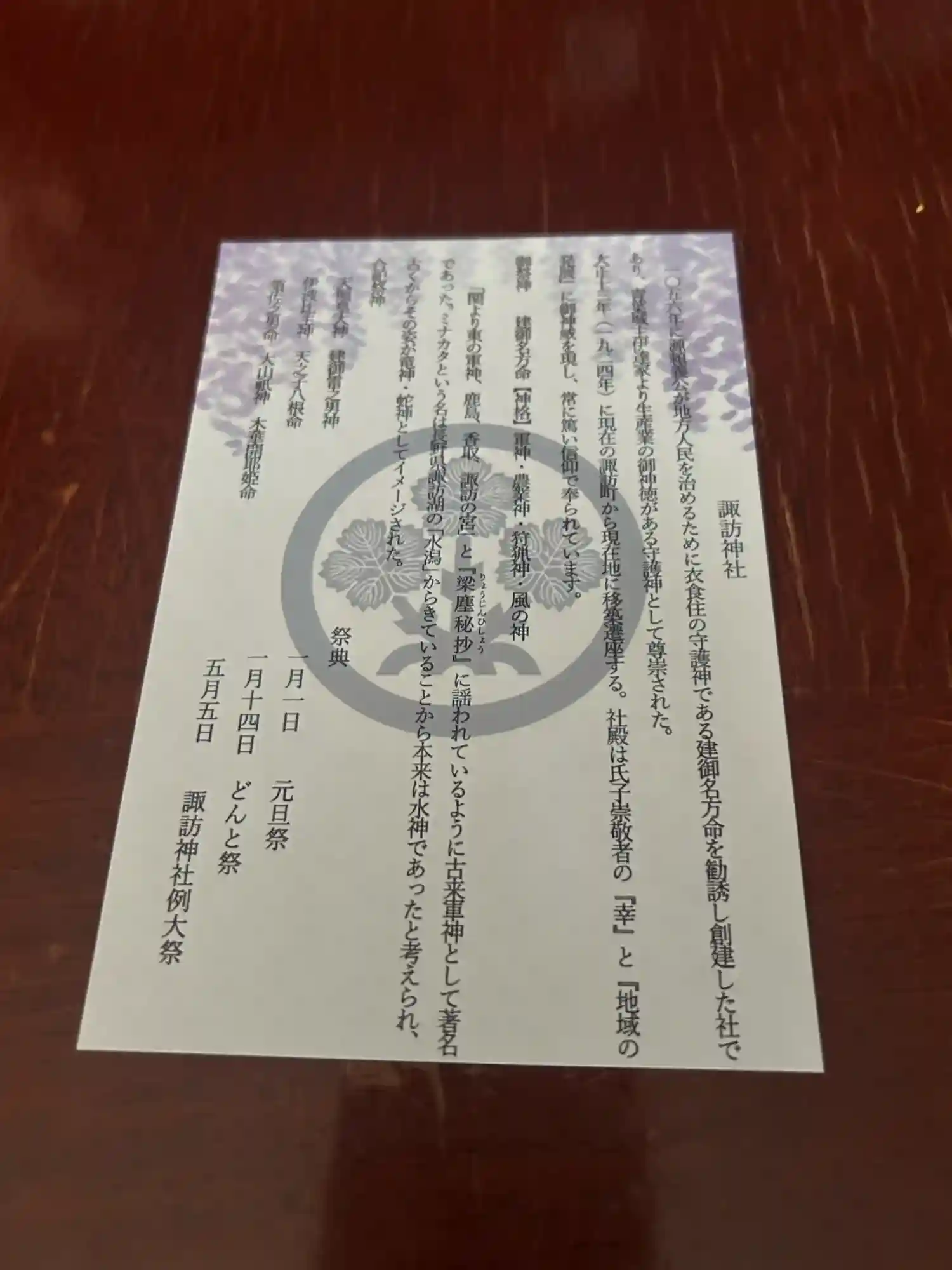 | ご祭神 | 御祭神 建御名方神 合祀祭神 天照皇大神 建御雷之男神 伊波比主神 天之子八根命 素比戔嗚尊 大山祇神 |
