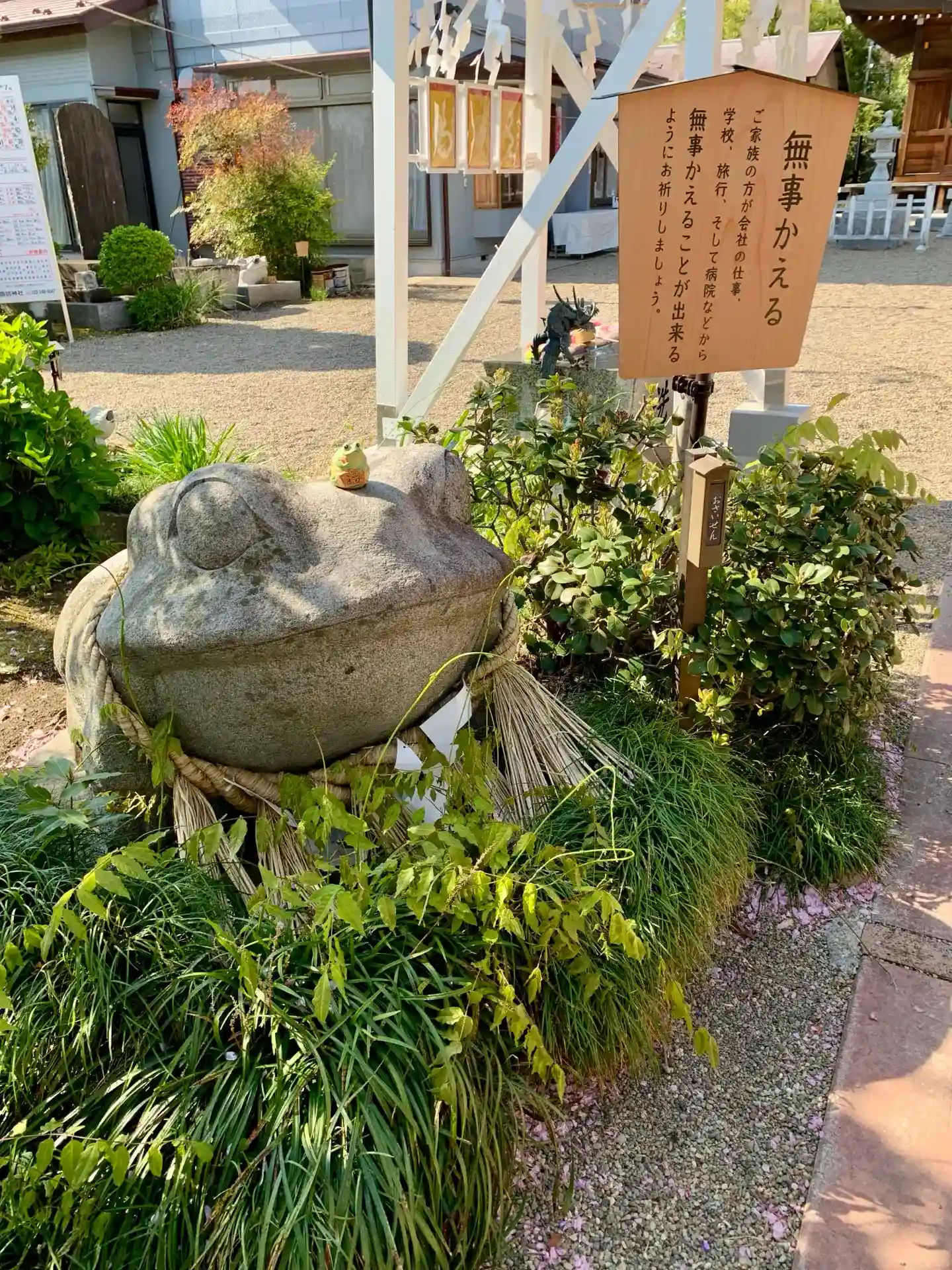 諏訪神社 参道を進んでいくと左側に、無事かえる像があります