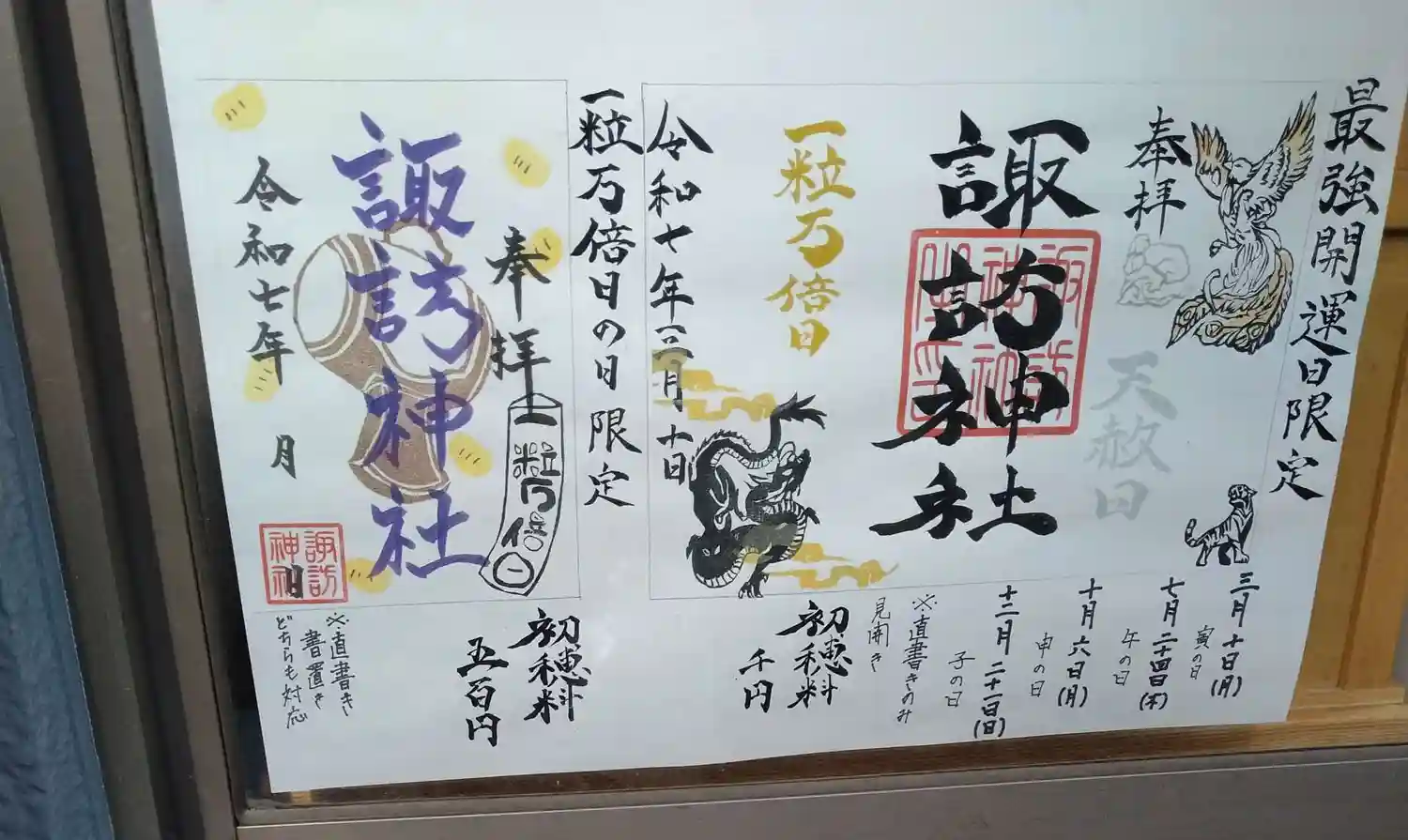 諏訪神社 最強開運日限定御朱印等が書かれてます。場所(社務所)の所に貼ってありました