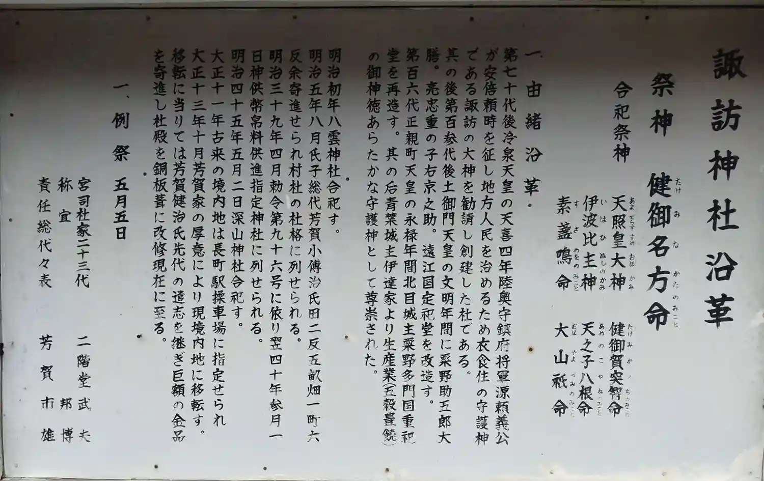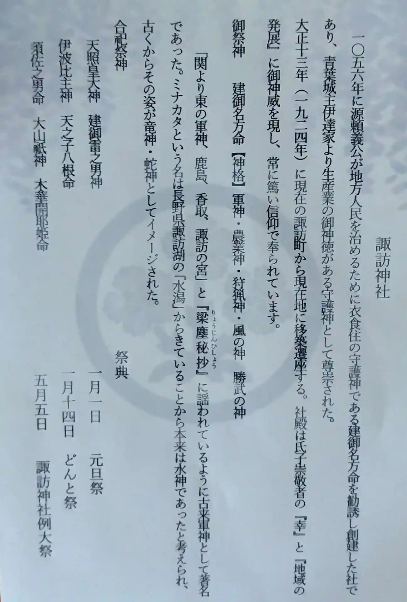 諏訪神社 地域の皆様方の信仰(幸、地域の発展)、御祭神、合祀祭神、祭典が書かれてます