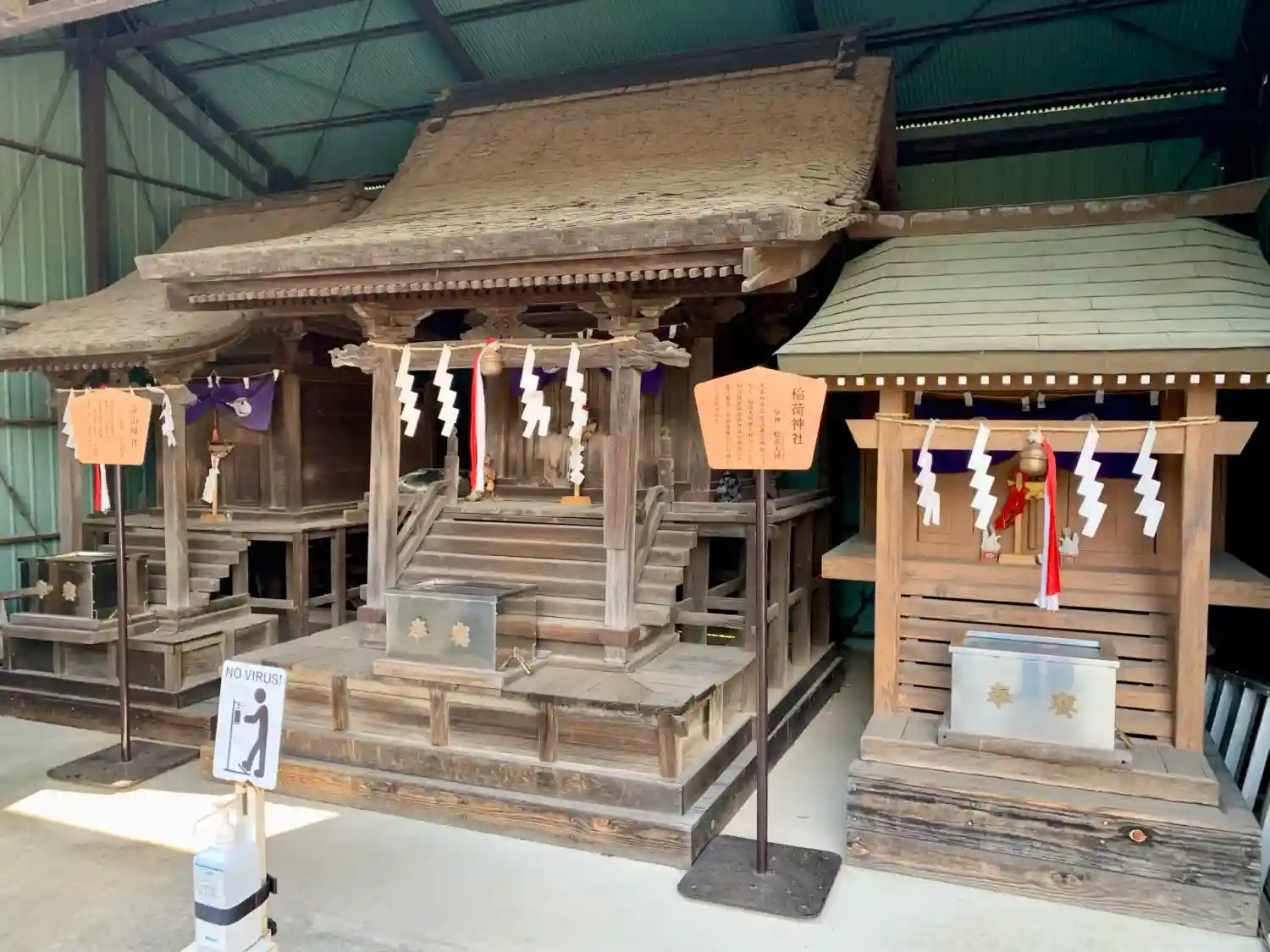 諏訪神社 拝殿前左側に境内社(右:稲荷神社(稲荷大神様)、中:深山神社(大山祇神様、木華開耶姫命様)左:八雲神社(須佐之男命様)