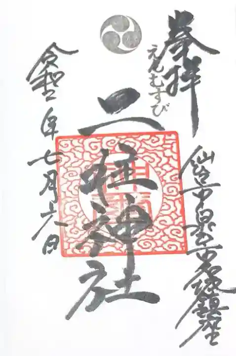 真ん中に二柱神社、右下に仙台市泉区市名坂鎮座と書かれ、真ん中に三つ巴紋、えんむすびの印、神璽の印が押されています。