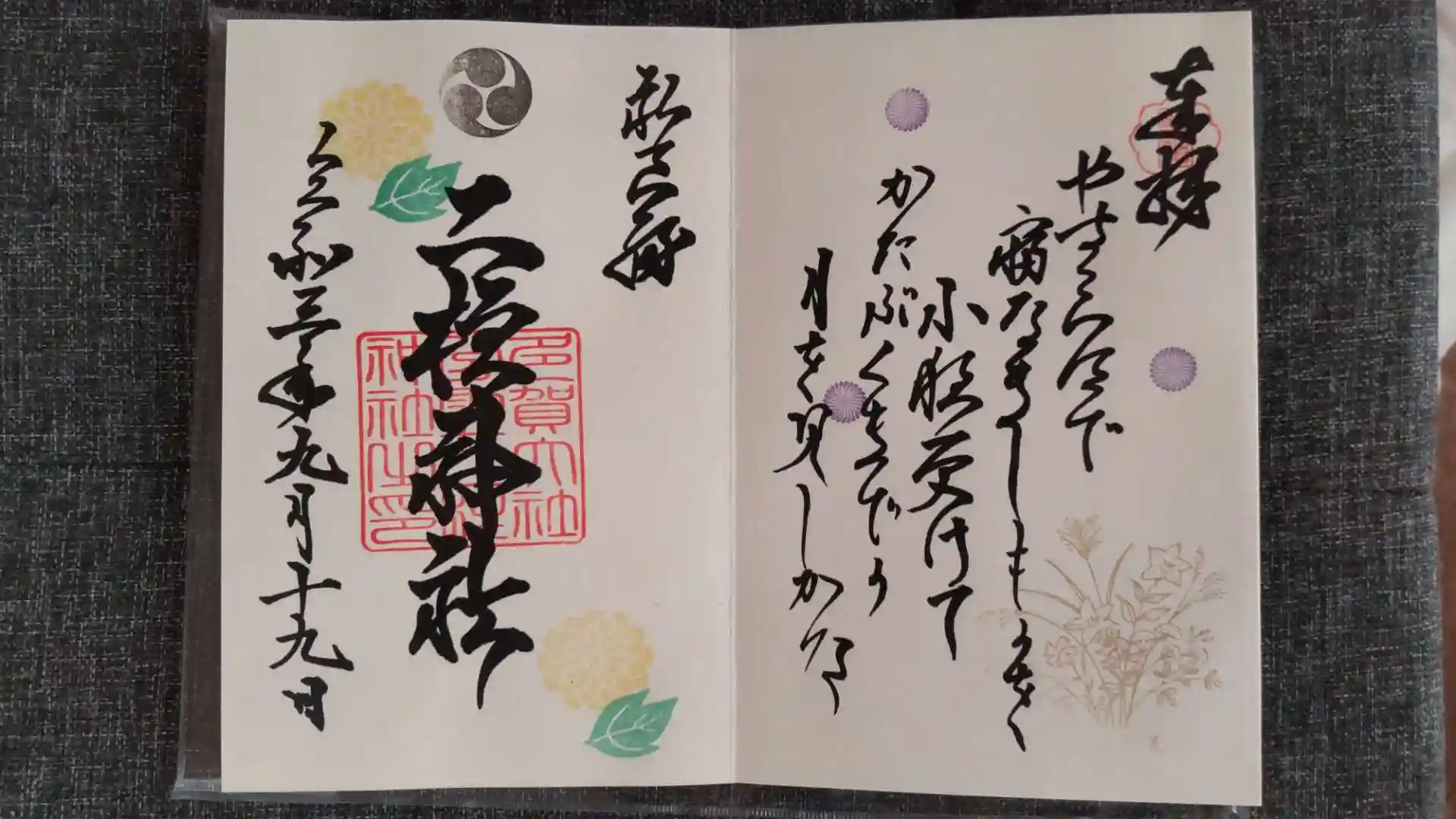 ご朱印は片面か両面か選べるようになっていて、どちらにしようかちょっと迷ったけれど、せっかく来たから欲張って両面を選択。両面だと和歌がプラスされるよう。コロナ対策で書置きかしらと思っていたら、直書して頂けて嬉しかったです。ありがとうございますm(_ _)m