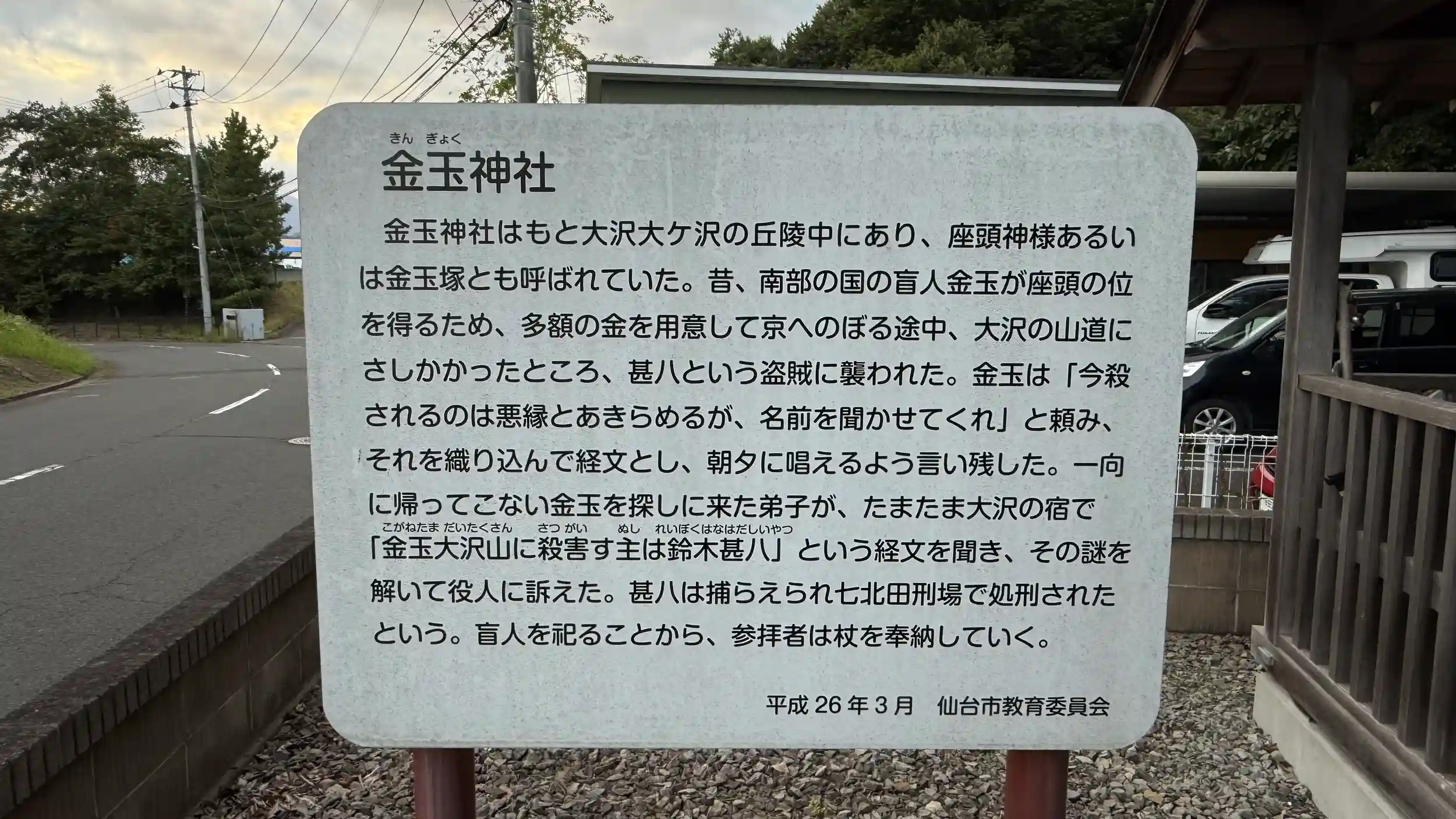 南部藩の座頭である金玉が、京(現・京都府京都市)への旅の途中、富谷丘陵にある当地で追いはぎに遭った。金玉は、その者にお経を教え、朝晩唱えるように指示して落命した。お経には、「どこ」で「誰」に襲われたかを入れ込んであったため、後にその者は捕らえられる結果になった。