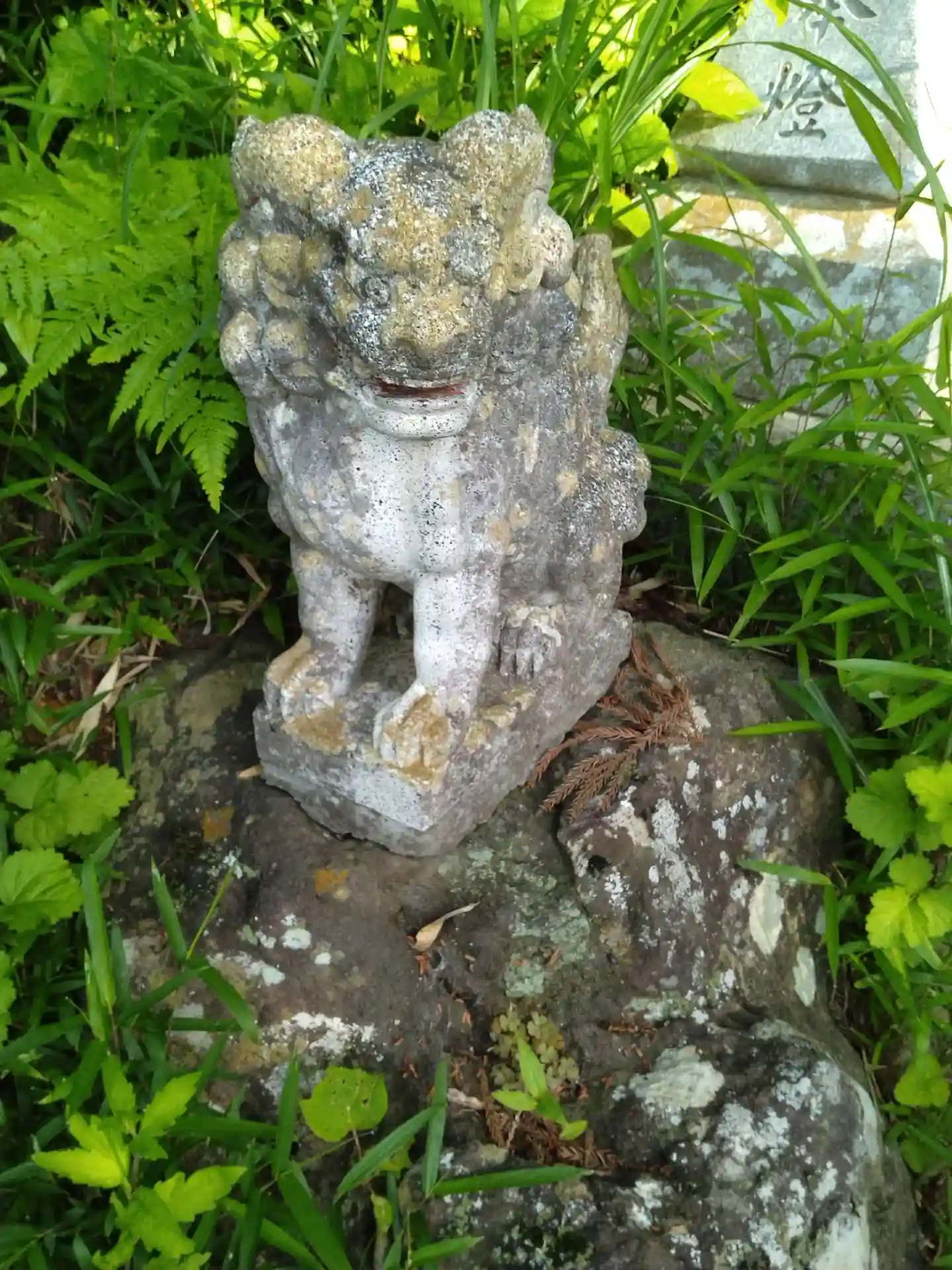 明石神社 参道脇に鎮座する(吽形の狛犬さん)の様子です