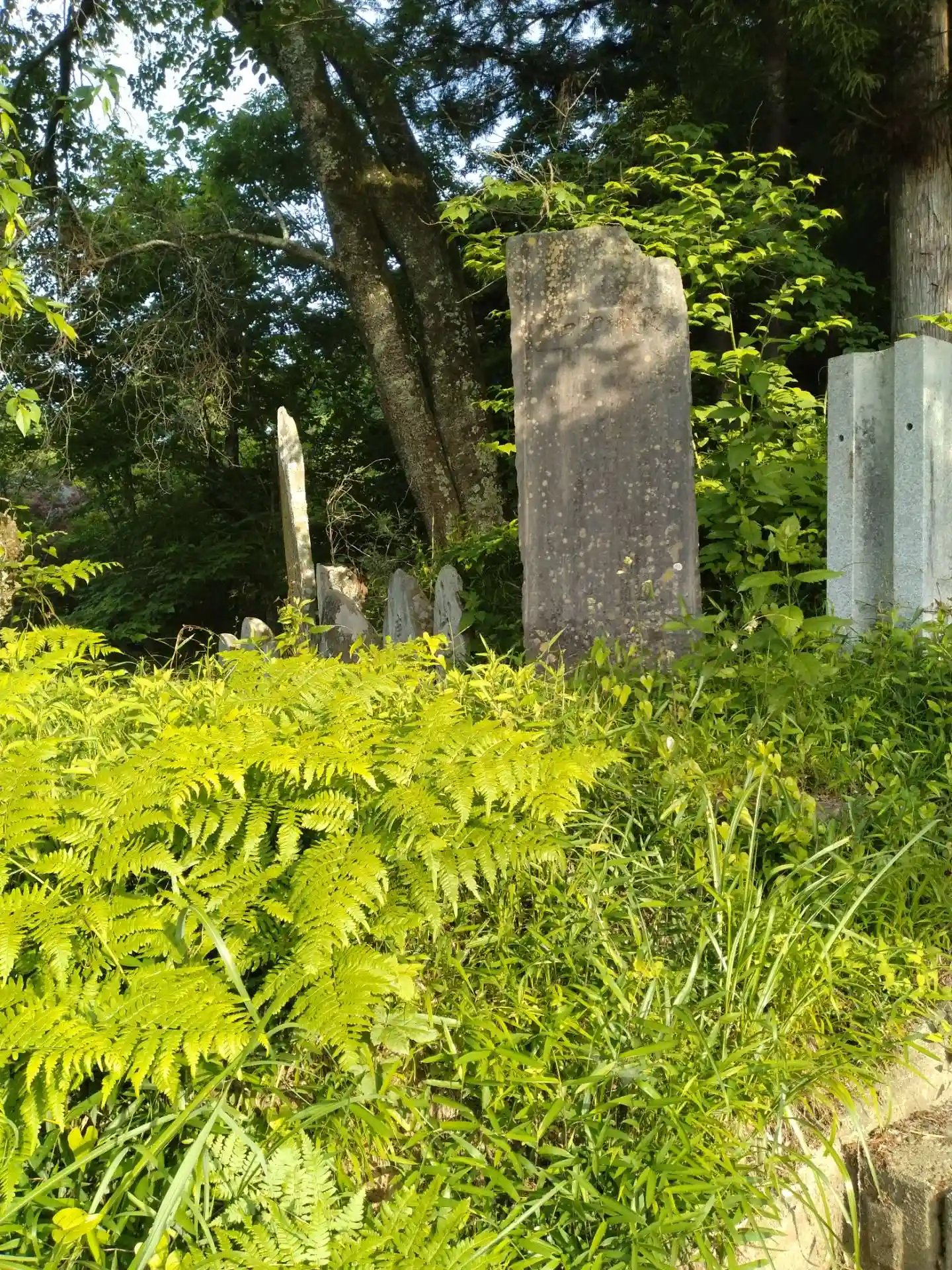 明石神社 道路側からの石塔、石碑の群れの様子です