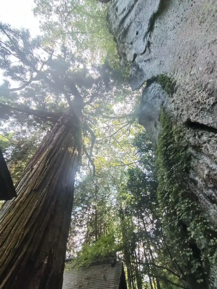 大岩壁と大銀杏が本殿前にひしめいています。