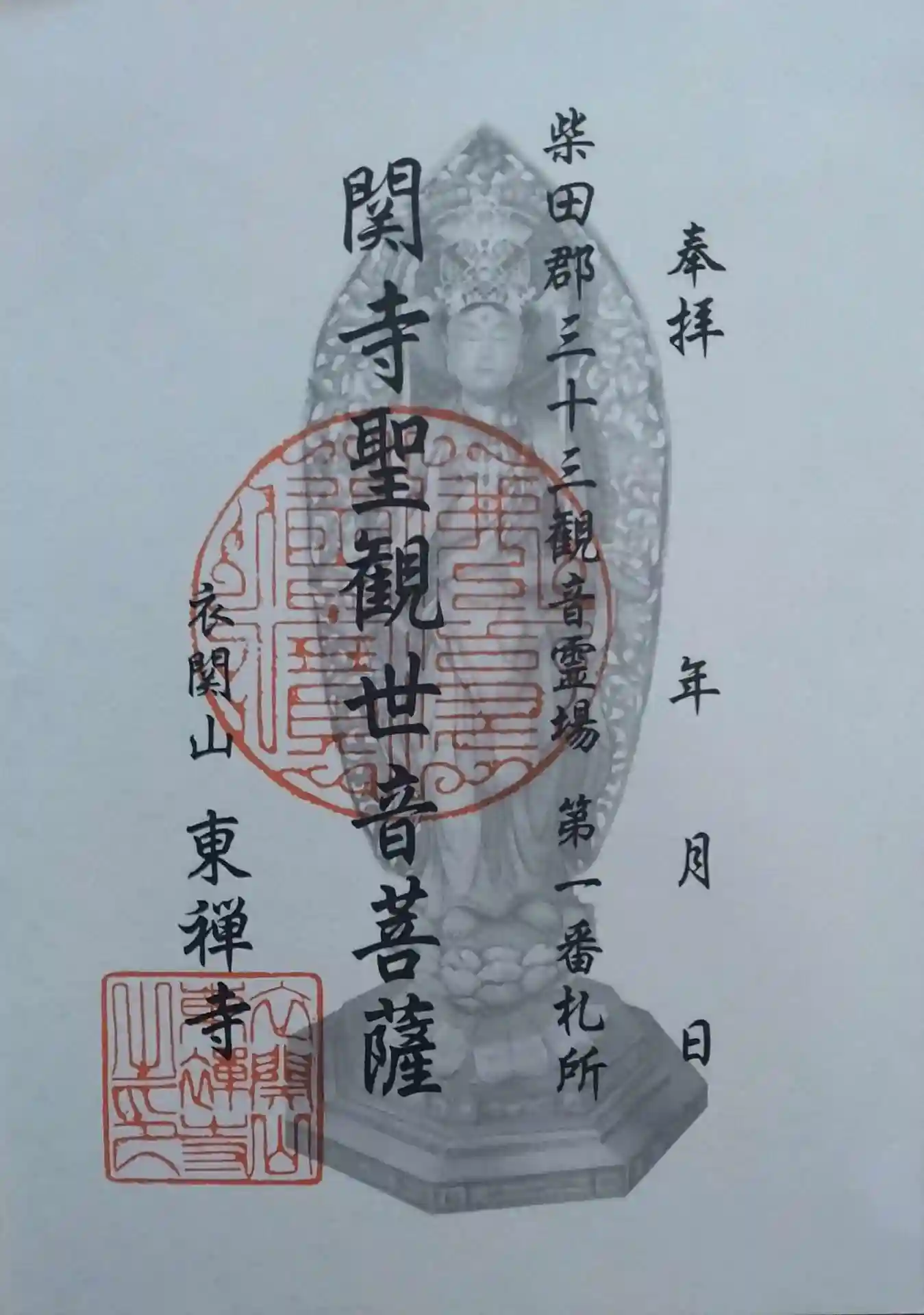柴田郡三十三観音霊場(第一番札所)関寺聖観世音菩薩様:衣関山東禅寺)御朱印です