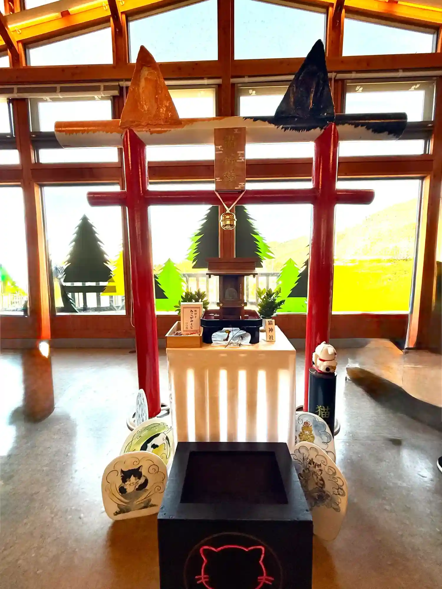 猫の貯金箱がお賽銭箱になっていて、右下の肉球マークの上にお金を乗せると箱の中から猫が出てきてお賽銭を回収してくれます(笑)