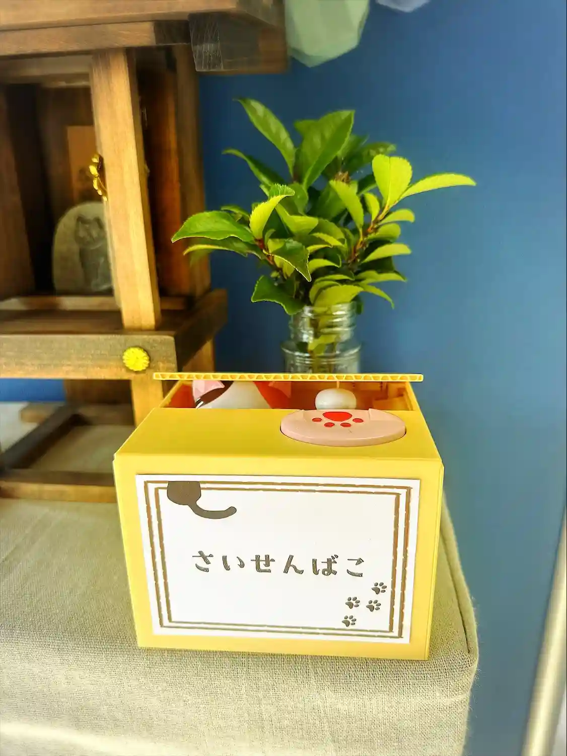猫の貯金箱がお賽銭箱になっていて、右下の肉球マークの上にお金を乗せると箱の中から猫が出てきてお賽銭を回収してくれます(笑)
