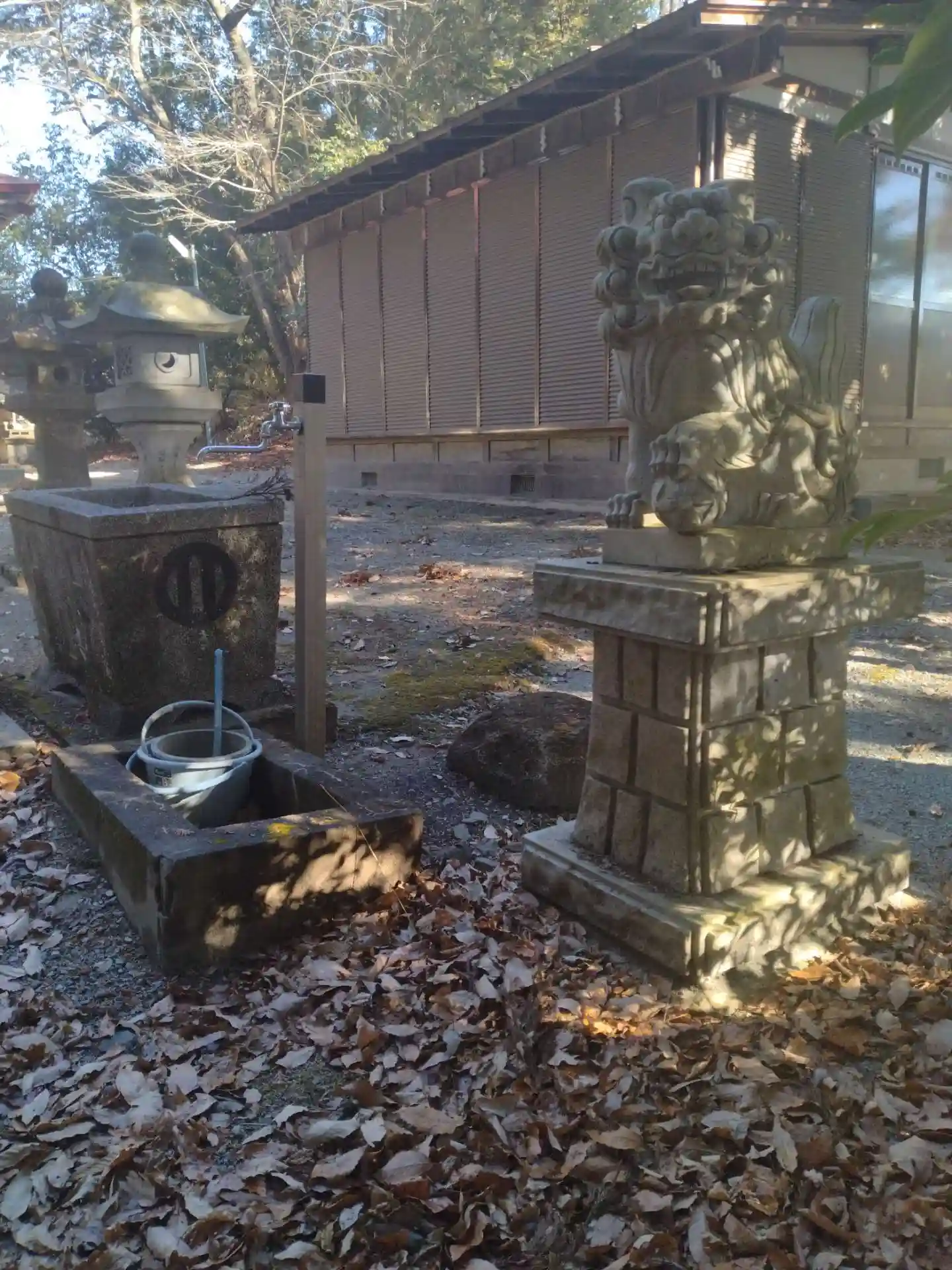 藤田神社 参道から登った右側に手水舎、狛犬さんの様子です