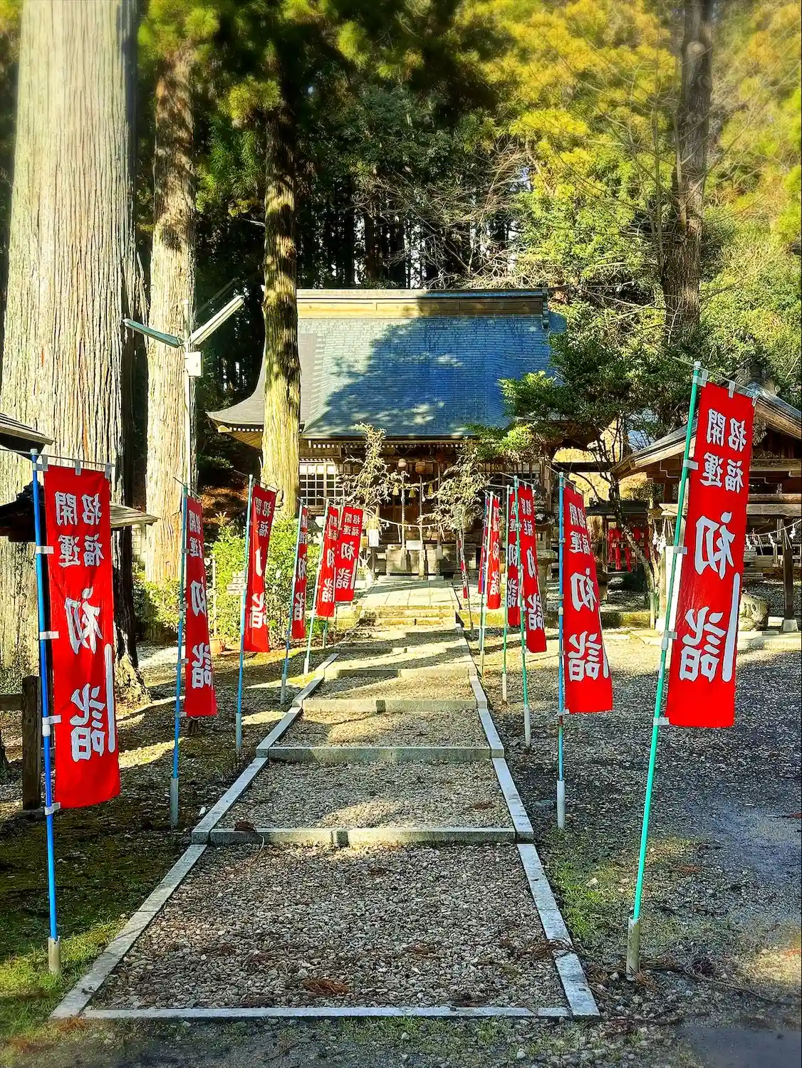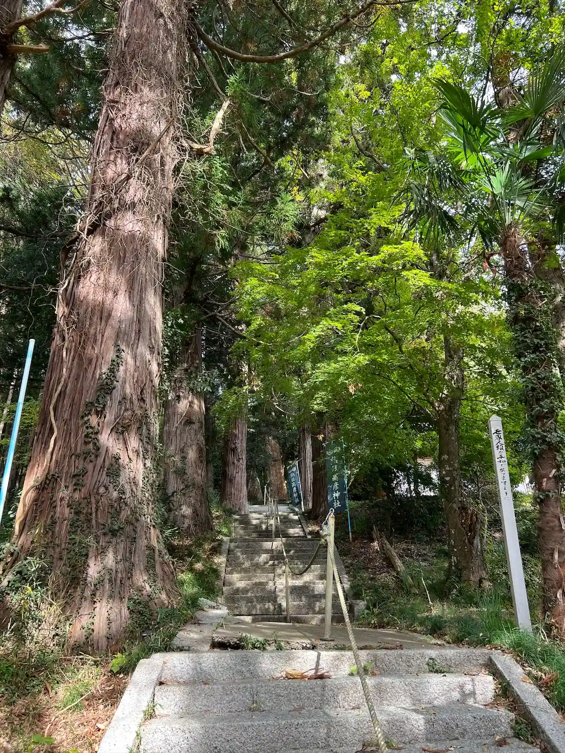 駐車場がよく分からず鳥居横に路上駐車して参拝。参道の石階段はかなりガタガタでかなり歩きずらいです🚶…