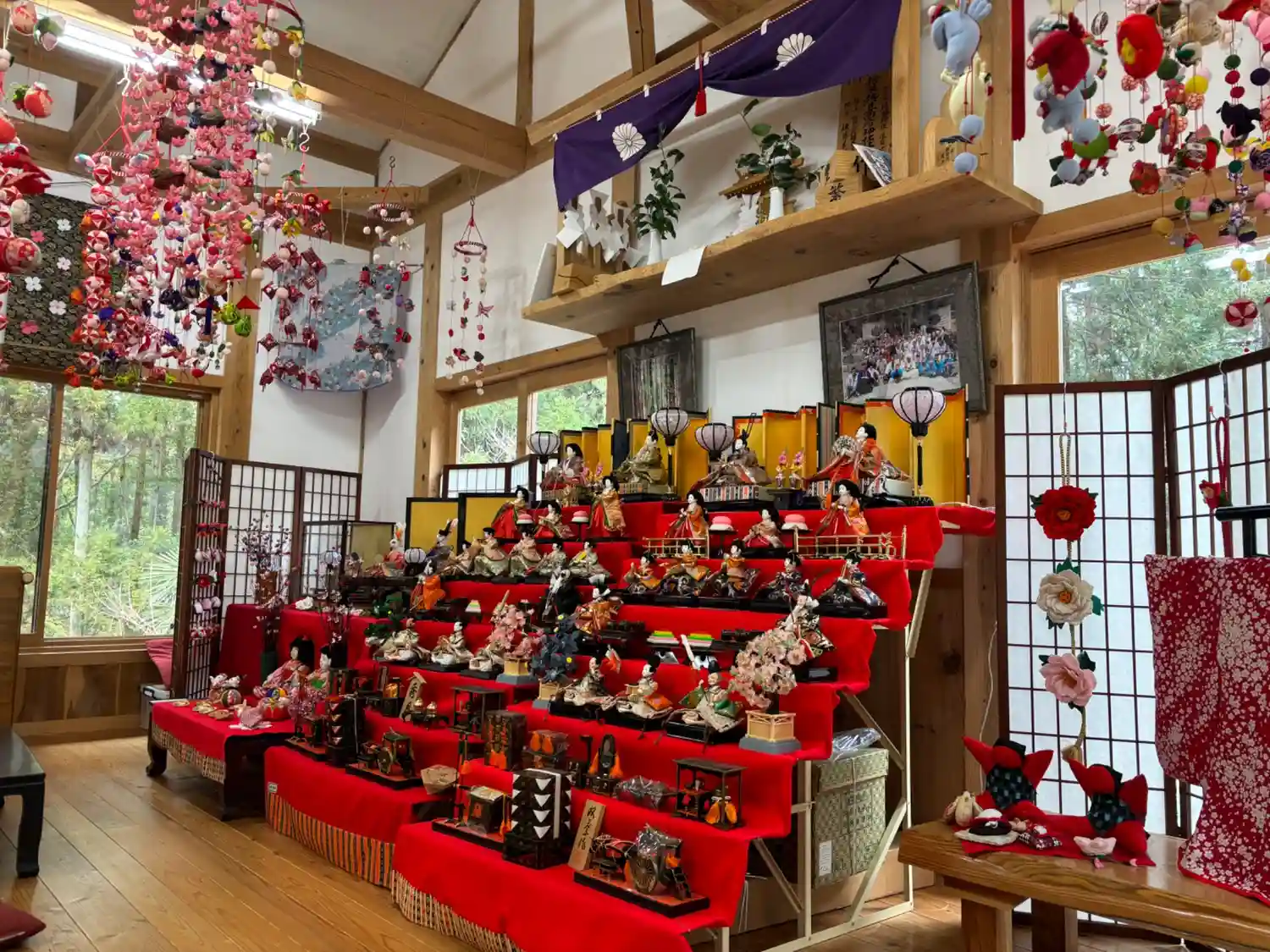 3組の雛壇と天井からの吊るし雛で華やかな感じです。