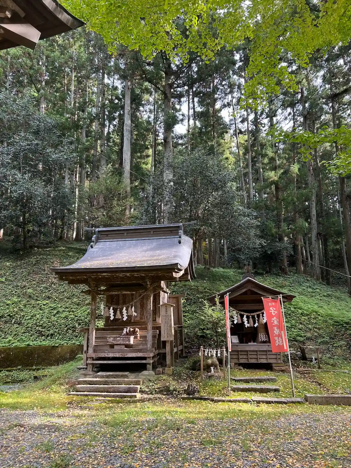 手前が白山姫神社で、幟旗の立っているほうが山神社