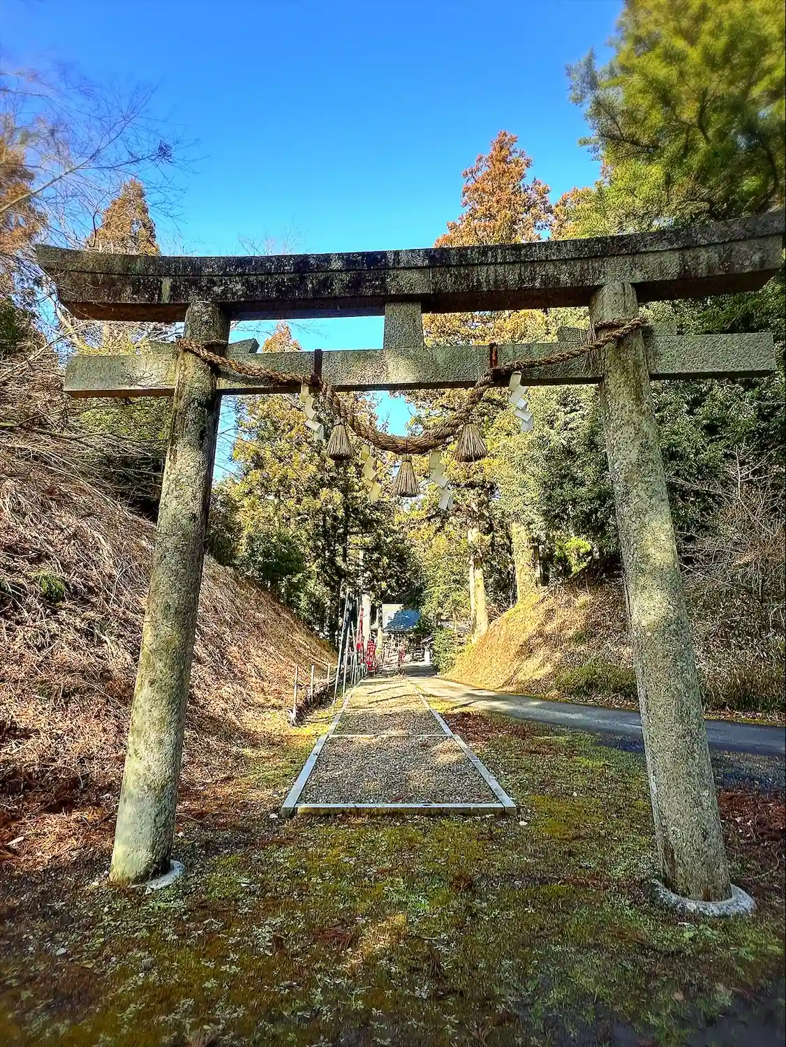 国道115号に一ノ鳥居が見えそこを目印に曲がると、参道入り口があり、その脇の道を上…