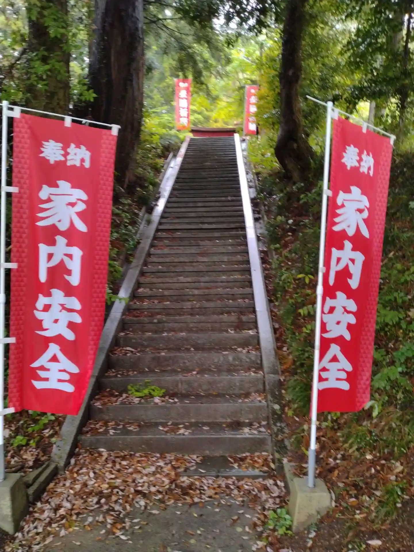 鹿島神社(小斎) 鳥居からの参道と奉納旗(家内安全と奥側に必勝祈願)の様子です