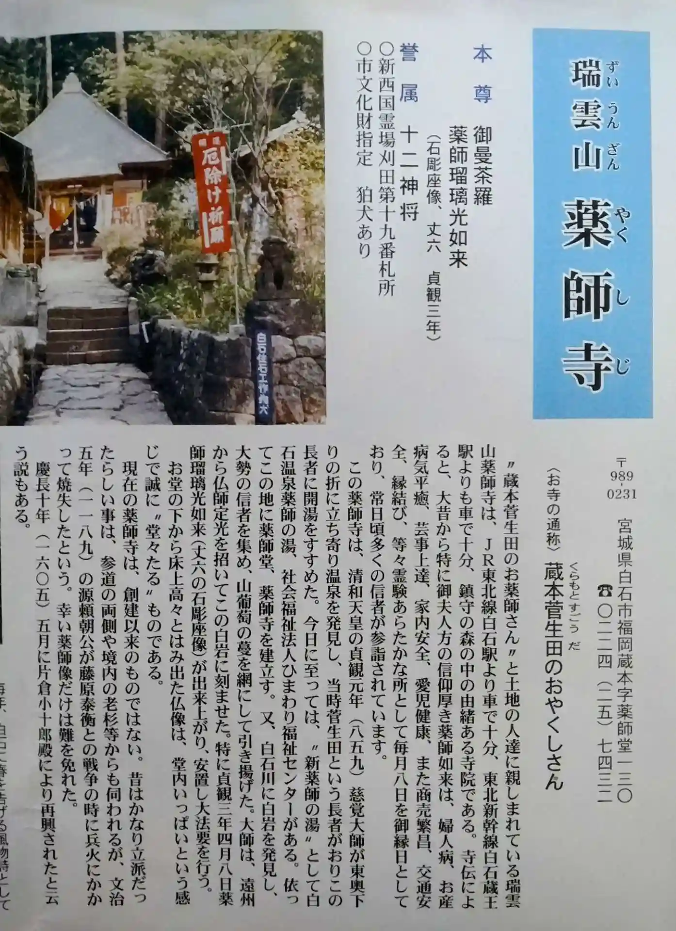 薬師寺 本堂内には(慈覚大師様が彫られたという石像(薬師瑠璃光如来様、十二神将様)が祀られていました(本堂内に住職様の配慮により、見せて頂き参拝出来ました。