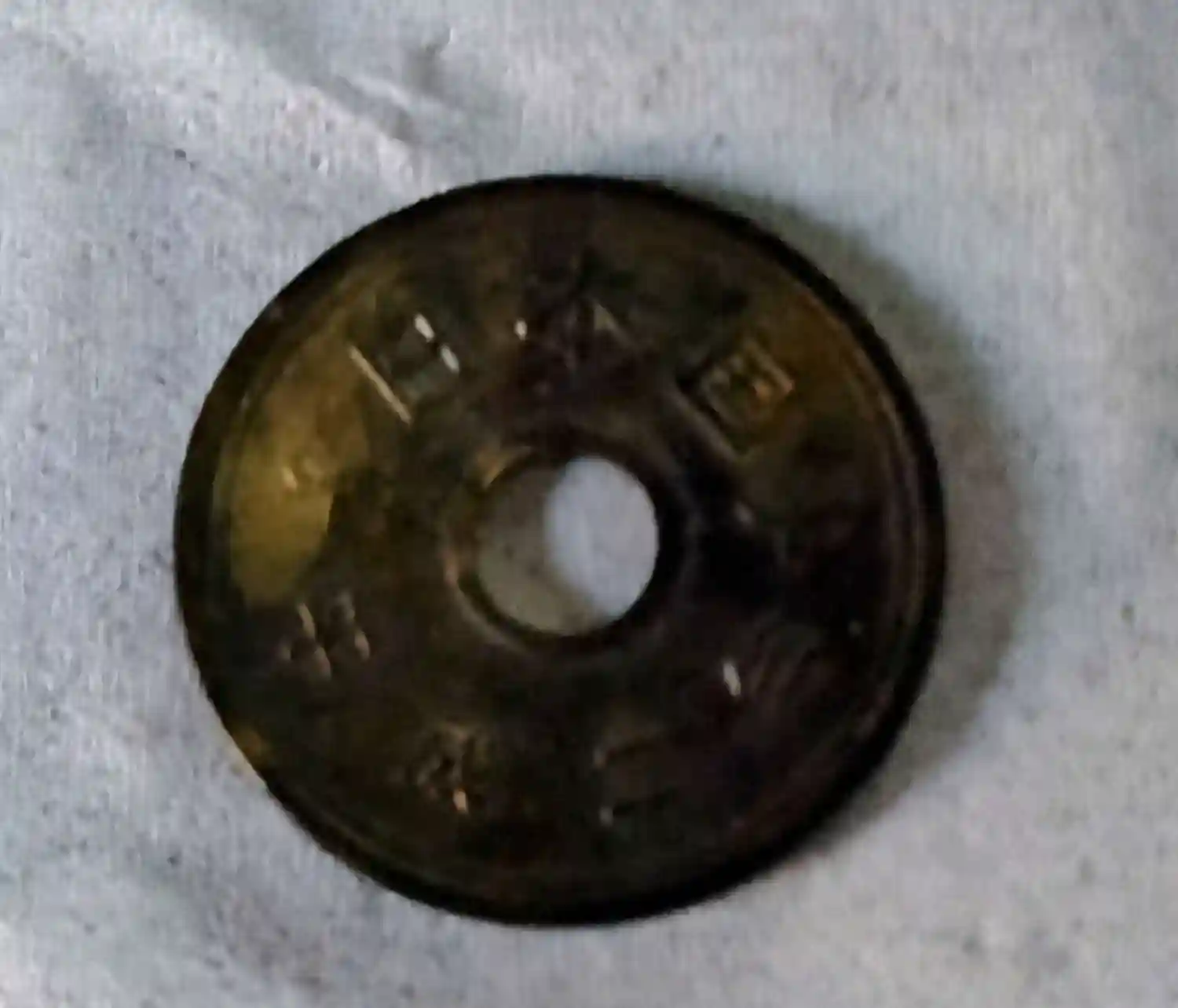 出雲神社 御神水で、清めた5円玉の表面です(ご賽銭のお礼と頂けるみたいです)