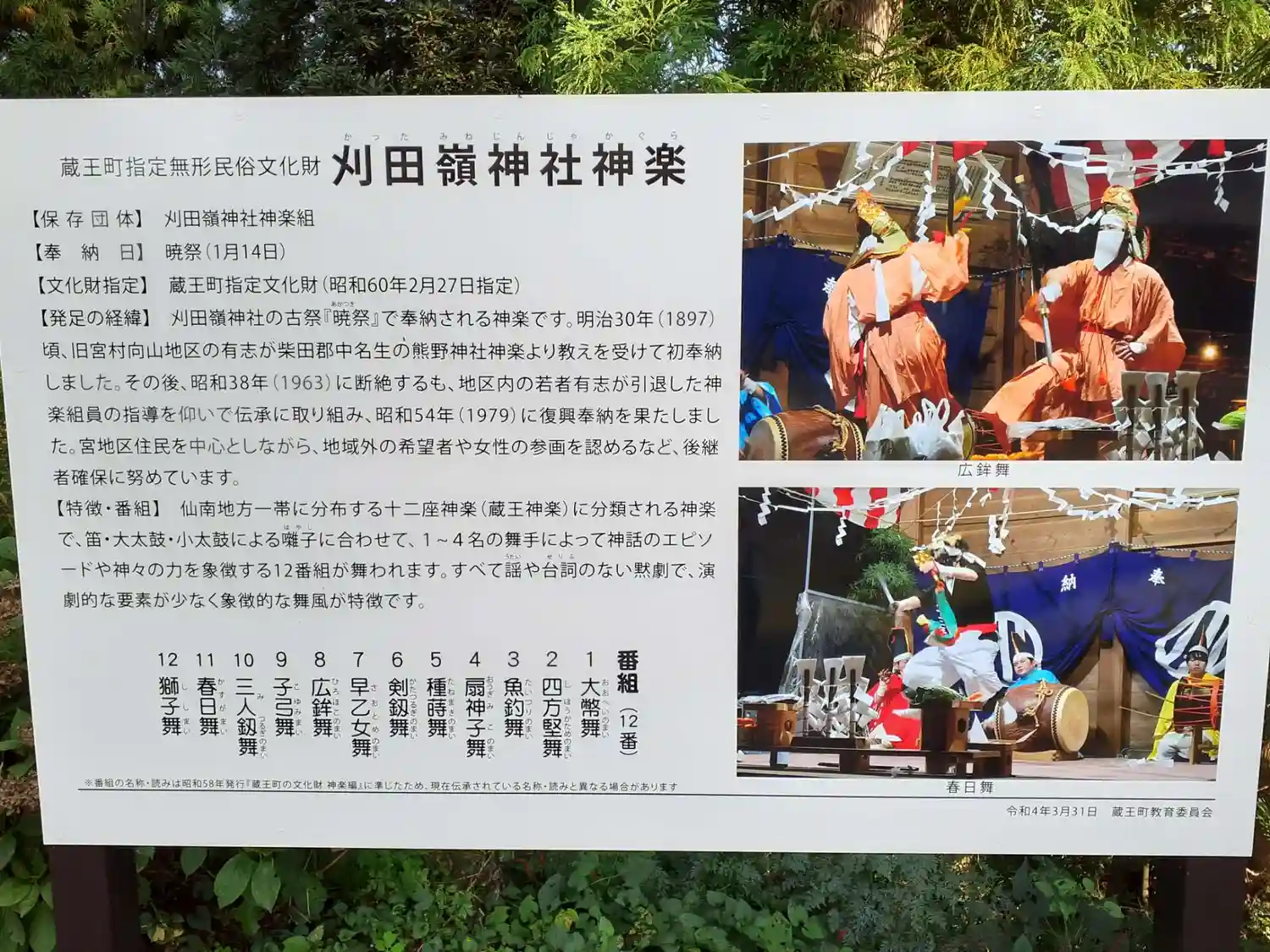 刈田嶺神社(白鳥大明神)境内にある(刈田嶺神社神楽)について書かれている案内板です