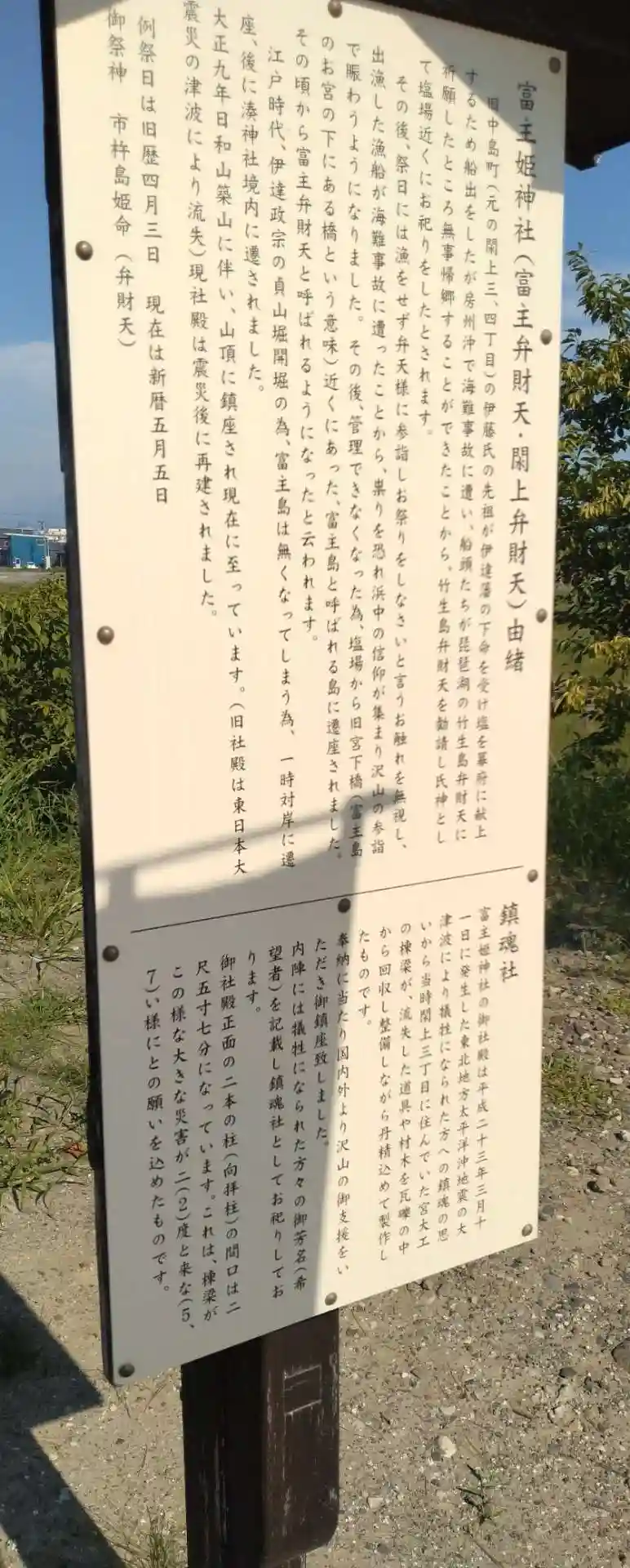 その後、豊漁守護の御利益が数々あり、町中より参詣者が絶えない事から富主島(現在の名取市閖上東1丁目と2丁目に架かる宮下橋付近)に遷座しましたが、伊達藩の貞山運河開掘などを機に一時冨主旅館へ遷座。