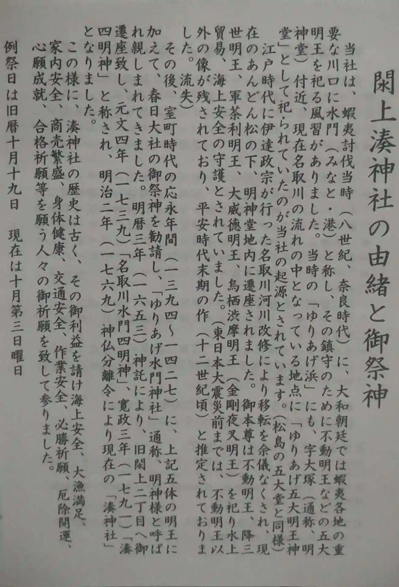 閖上湊神社 御朱印と一緒に頂いた(閖上湊神社の御祭神、由緒書き)です