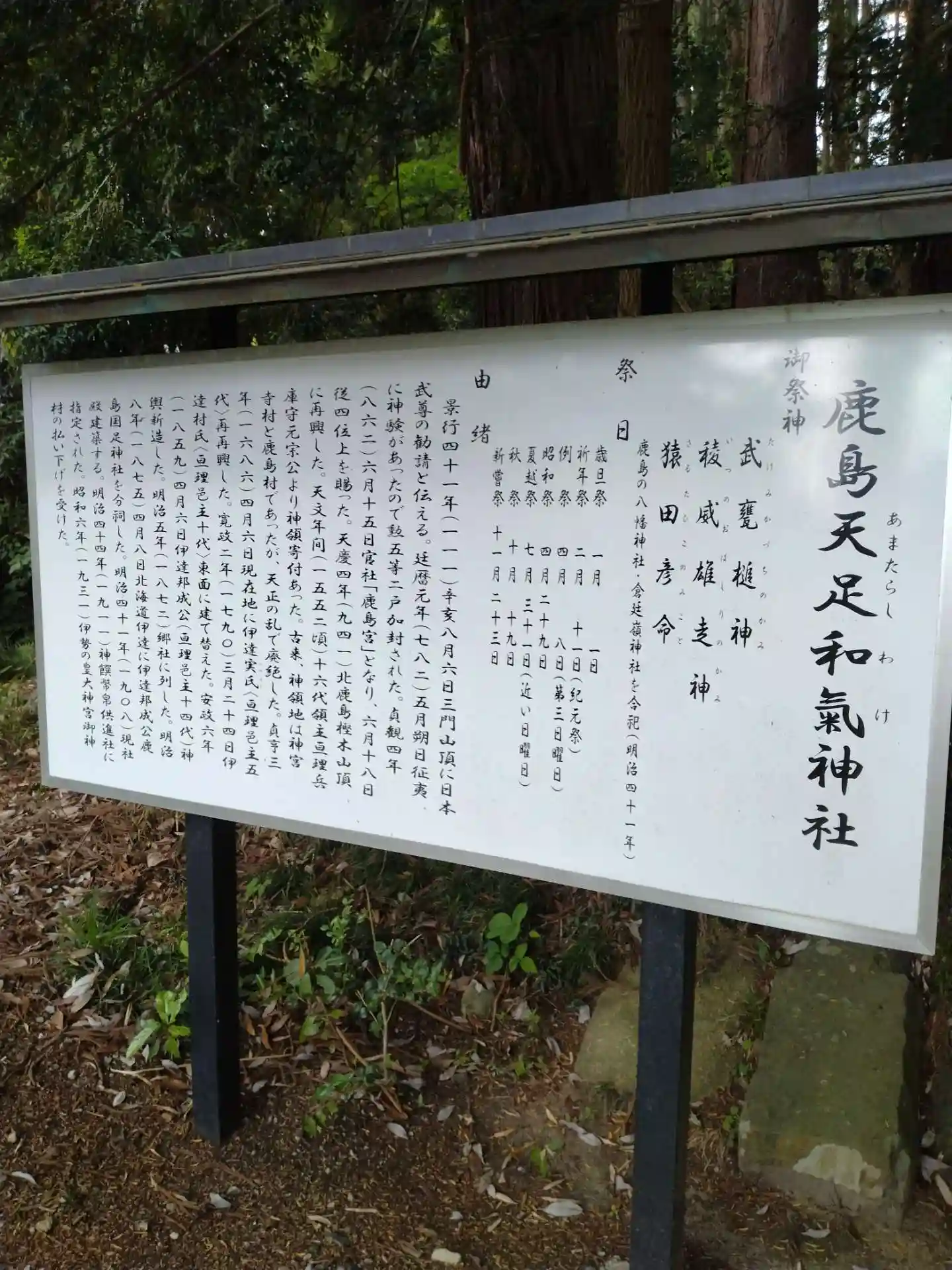 鹿島天足和氣神社 鳥居左側にある(鹿島天足和氣神社:御祭神、例祭日、由緒)が書かれてます