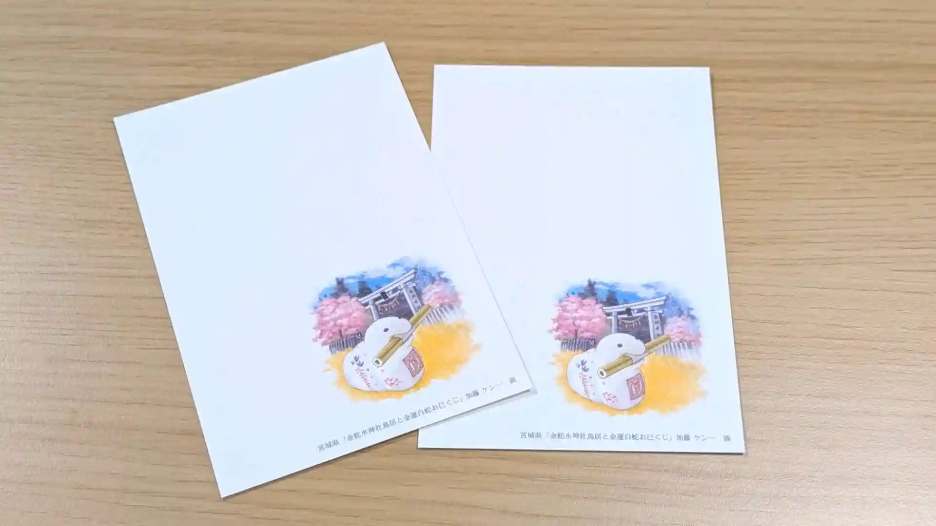 現在発売中の宮城県版年賀はがきは、当神社の鳥居と白蛇みくじの意匠となっています。数に限りがありますので、どうぞお早めにお求めください。
