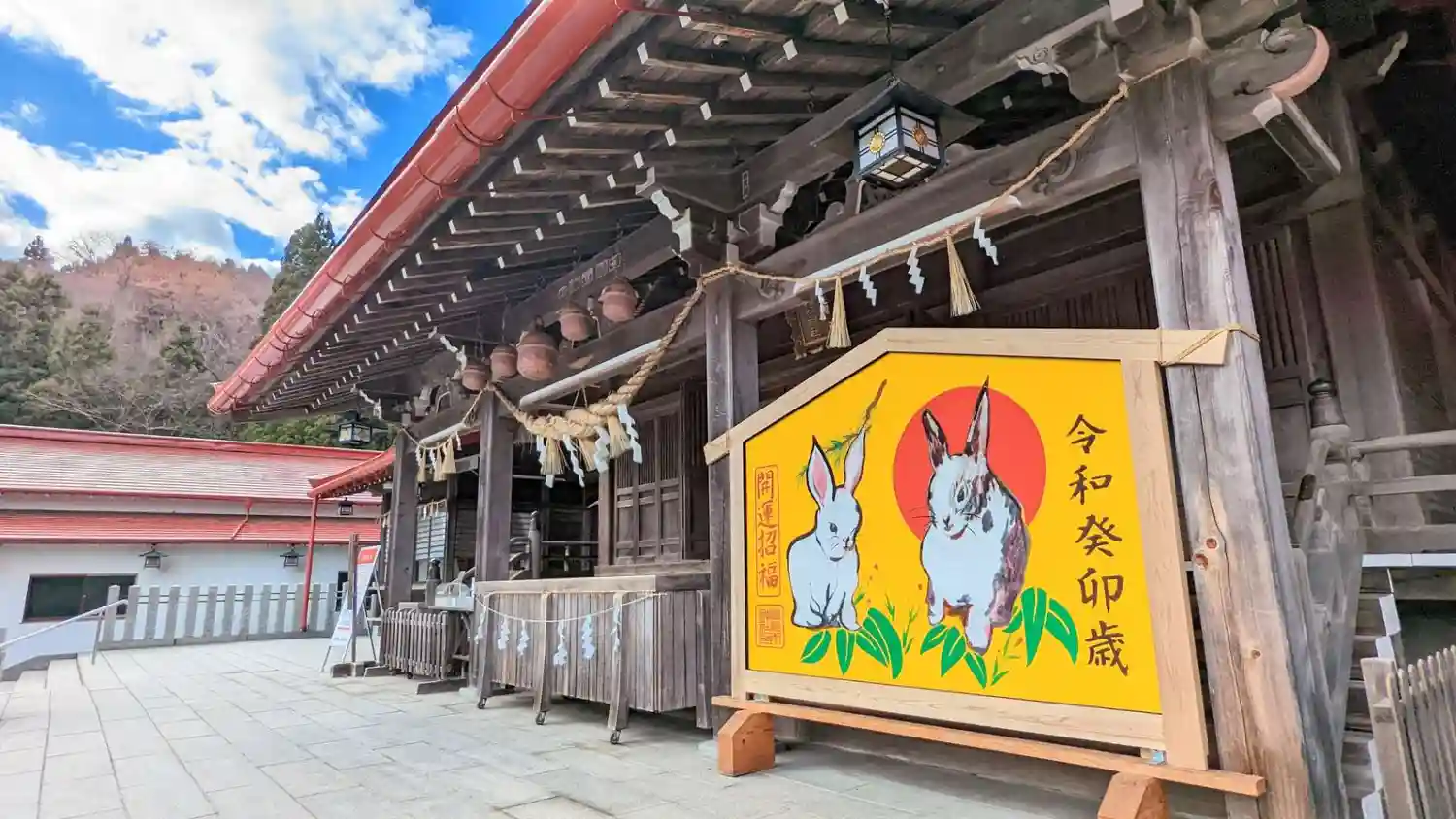 拝殿前に来年の干支「卯(うさぎ)」の大絵馬が設置されました。また境内では、注連縄奉製と雪吊りが佳境…