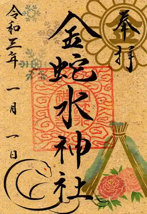 柄入りの金嶺紙に、真ん中に金蛇水神社と書かれ、右上に陰菊輪に丸に金文字の神紋、右下に牡丹のイラスト、真ん中に金蛇水神社印、左上に雪の結晶のイラスト、左下に蛇のイラストが入っています。