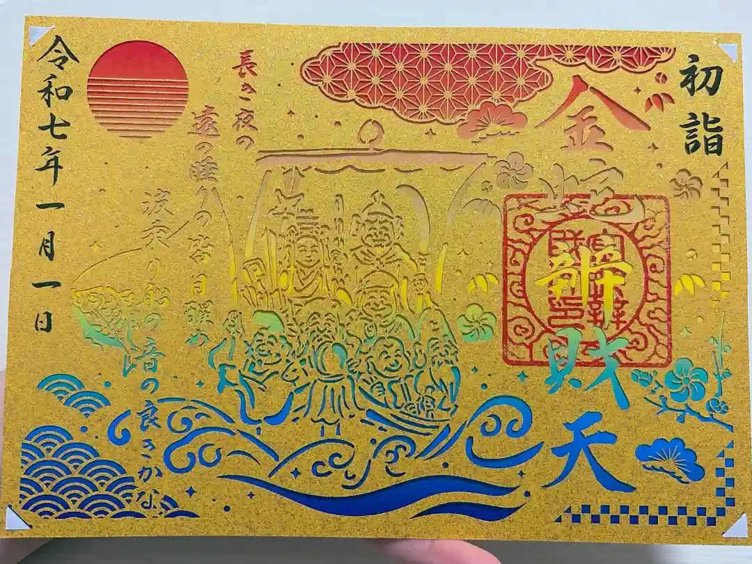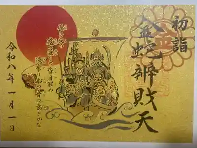 二面見開きの御朱印です。柄入りの金嶺紙に、真ん中に七福神が乗る宝船が描かれ、右面は真ん中に金蛇辨財天と書かれ、右上に陰菊輪に丸に金文字の神紋、下部に金蛇辨財天印、左面は真ん中に和歌「長き夜の 遠の睡りの皆目醒め 波乗り船の音の良きかな」、上部に初日の出のイラストが入っています。
