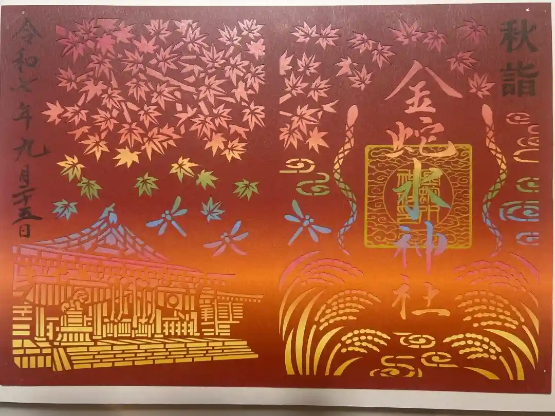 柄入りの金嶺紙に、真ん中に金蛇水神社と書かれ、右上に陰菊輪に丸に金文字の神紋、真ん中に金蛇水神社印、右下と左上に紅葉のイラスト、左下に蛇のイラストが入っています。