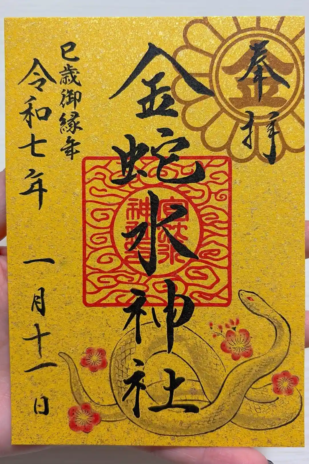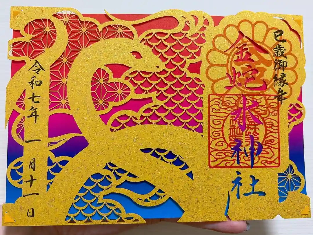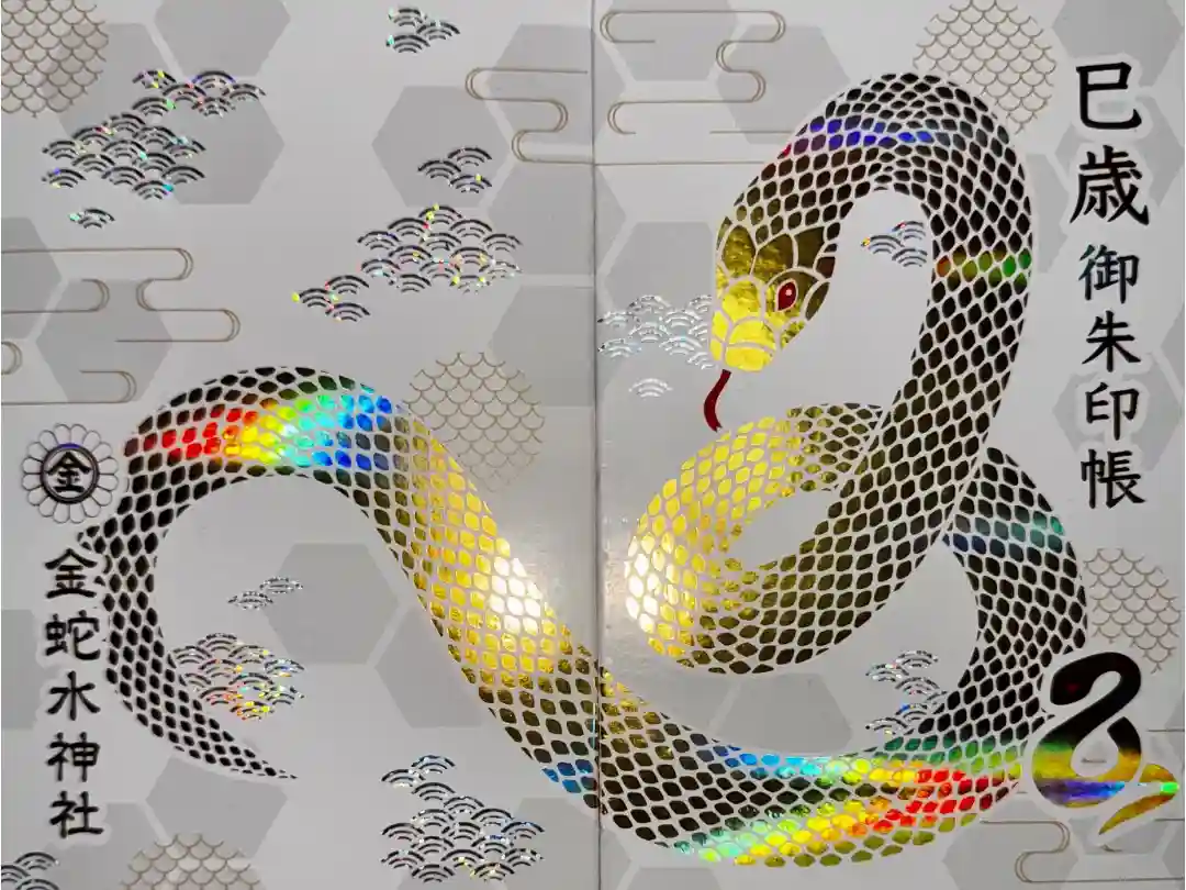 柄入りの金嶺紙に、真ん中に金蛇水神社と書かれ、右上に陰菊輪に丸に金文字の神紋、右下に牡丹のイラスト、真ん中に金蛇水神社印、左上に雪の結晶のイラスト、左下に蛇のイラストが入っています。