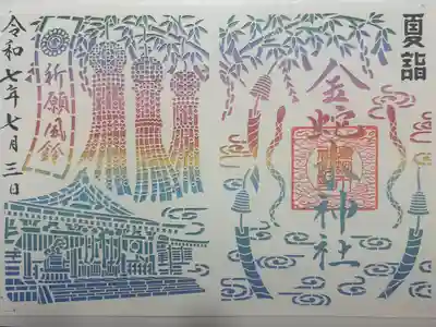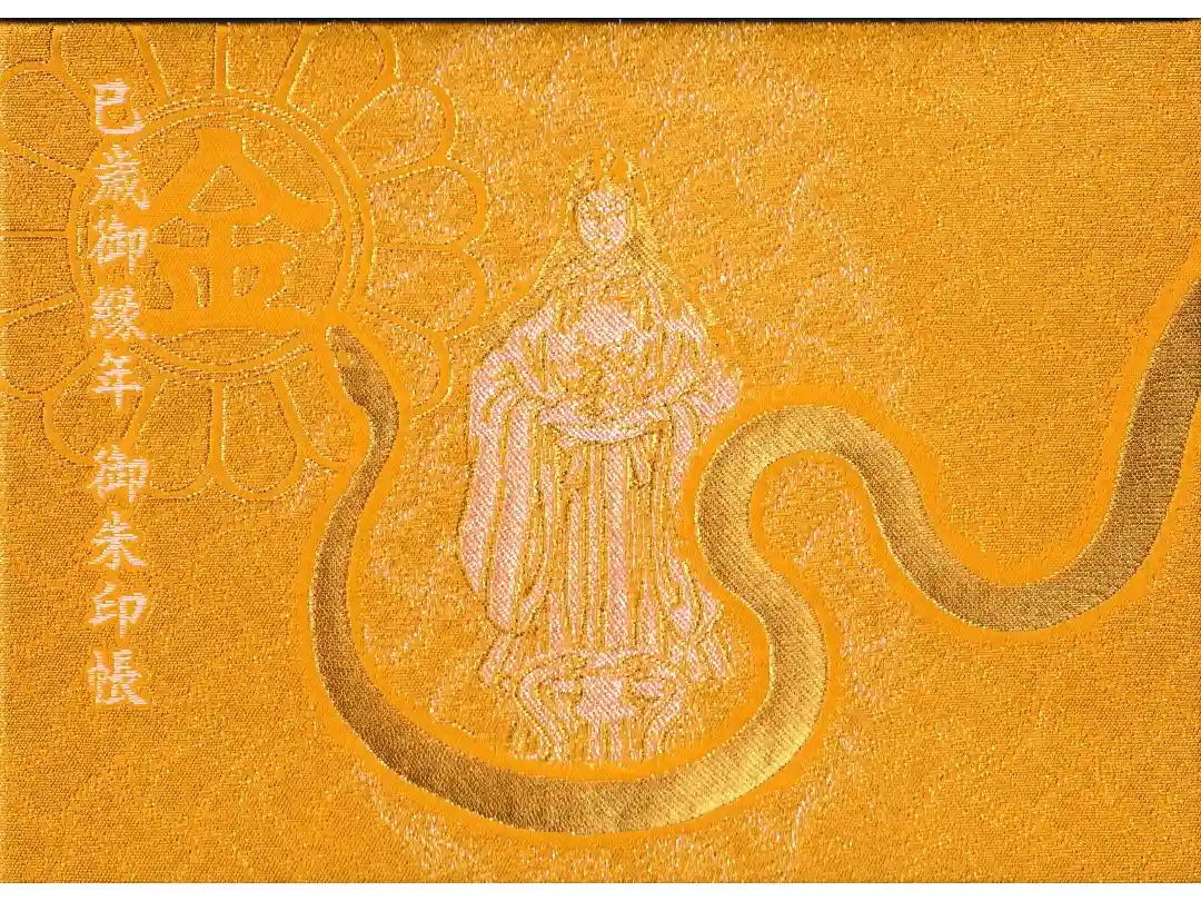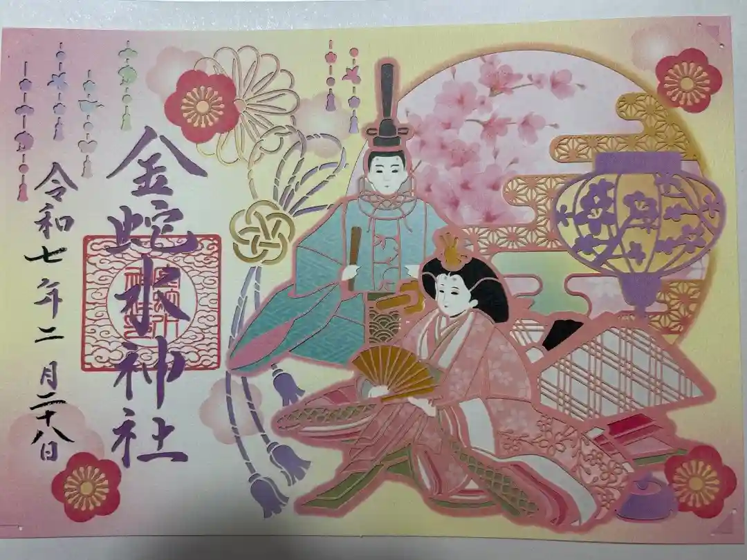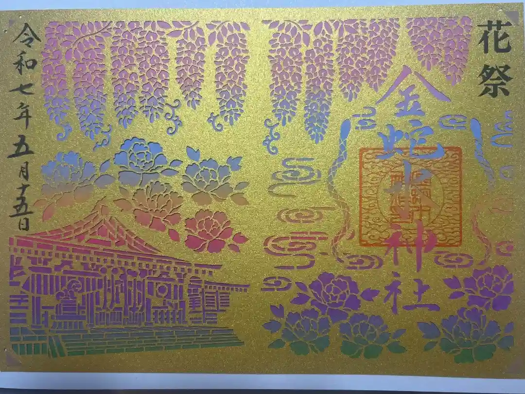 柄入りの金嶺紙に、真ん中に金蛇水神社と書かれ、右上に陰菊輪に丸に金文字の神紋、右下に牡丹のイラスト、真ん中に金蛇水神社印、左上に藤のイラスト、左下に蛇のイラストが入っています。