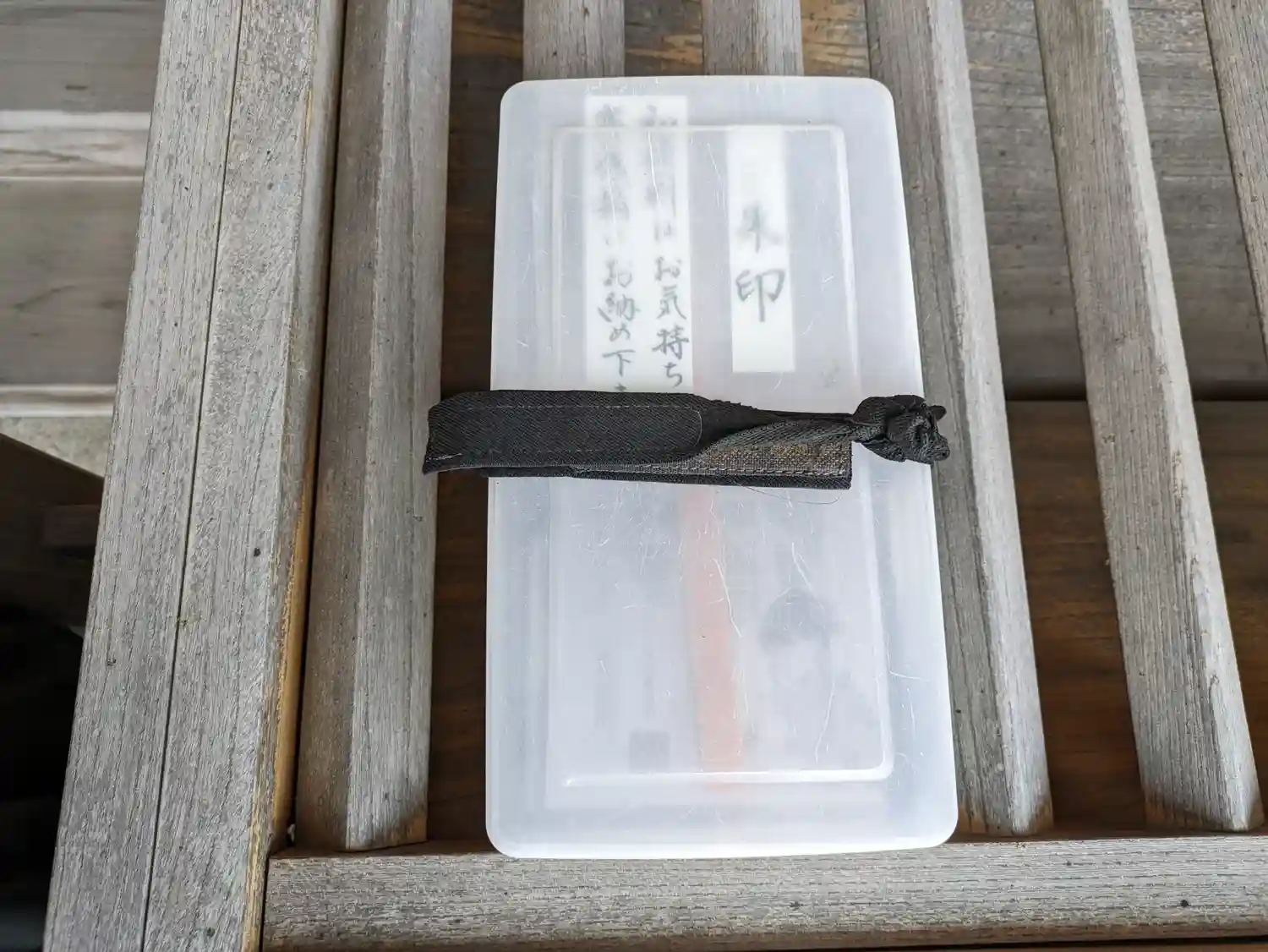 賽銭箱の上に御朱印が入ったケースが置いてあります。