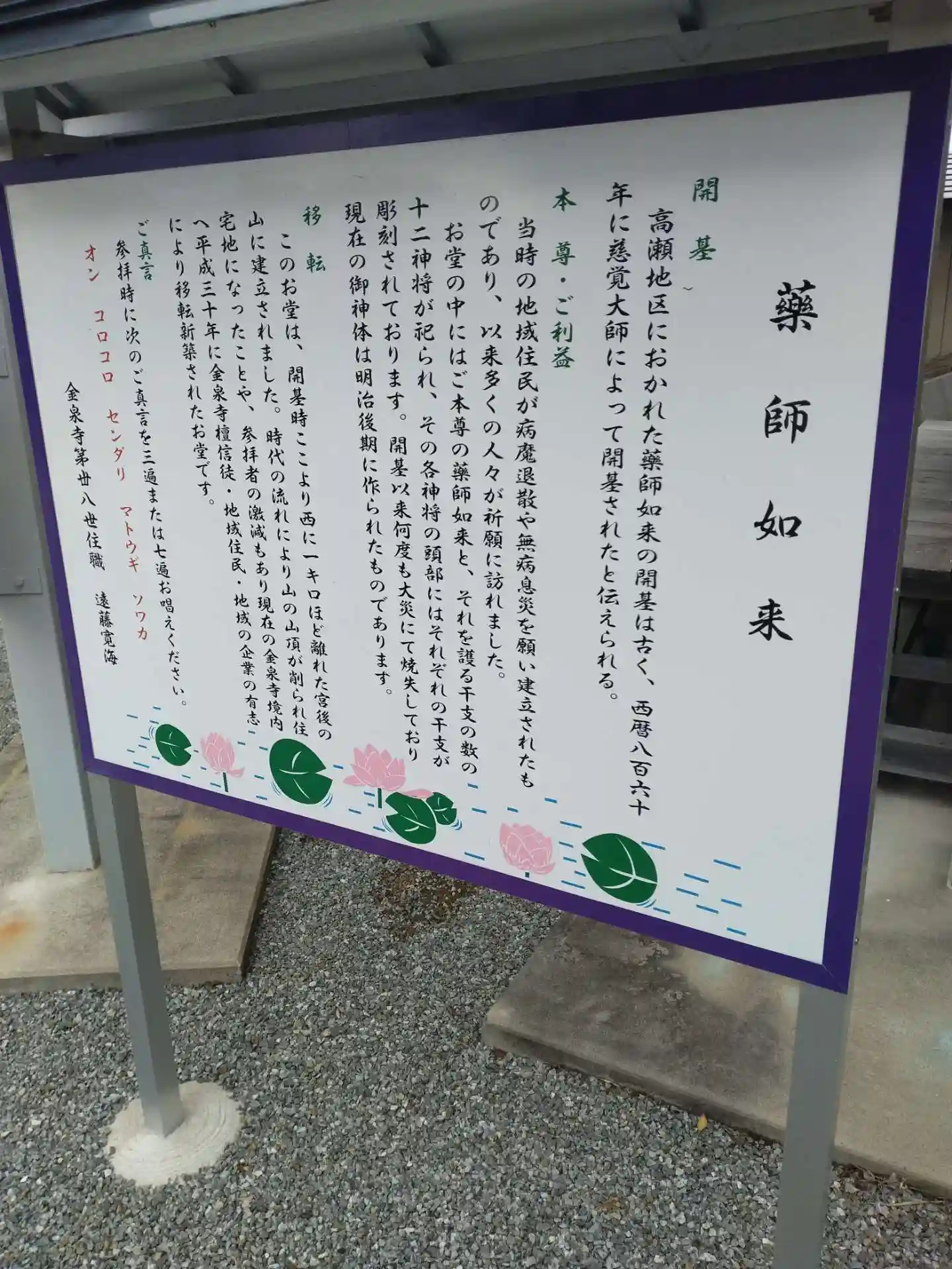 金泉寺 (薬師如来堂)左側にある(薬師如来様の開基、ご本尊薬師如来様)案内板です