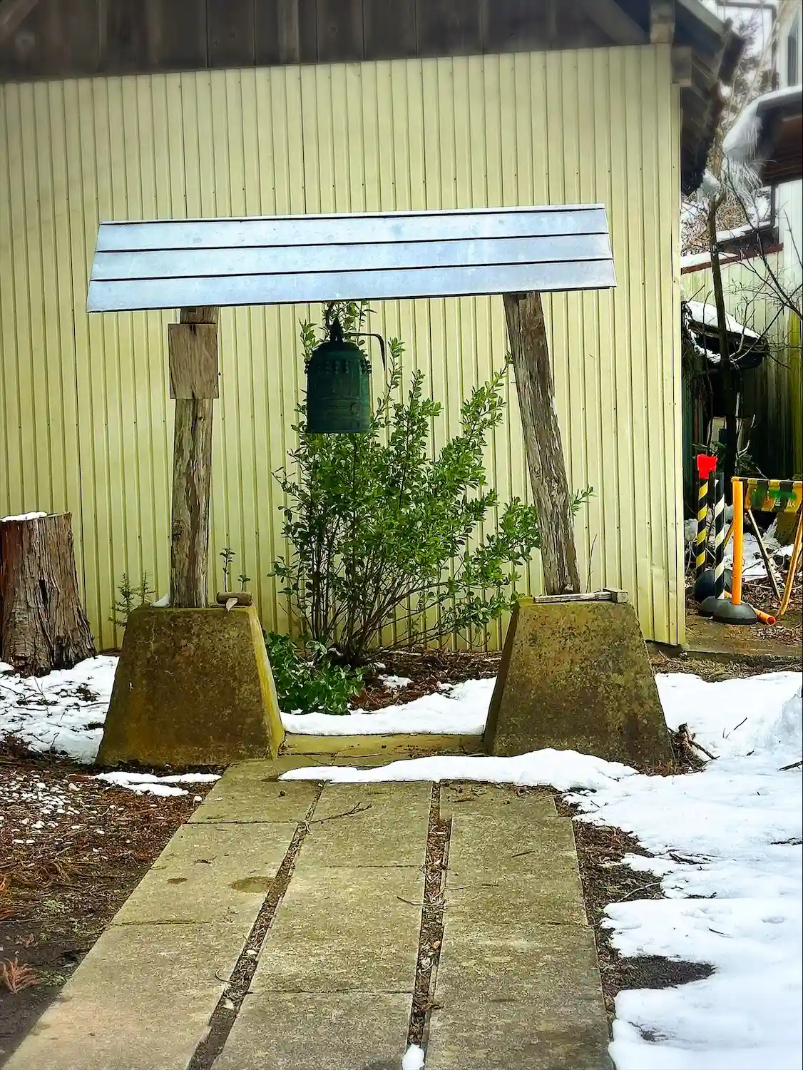 磯良神社 境内にある(左側小さな鐘釣と御神木推定)の様子です