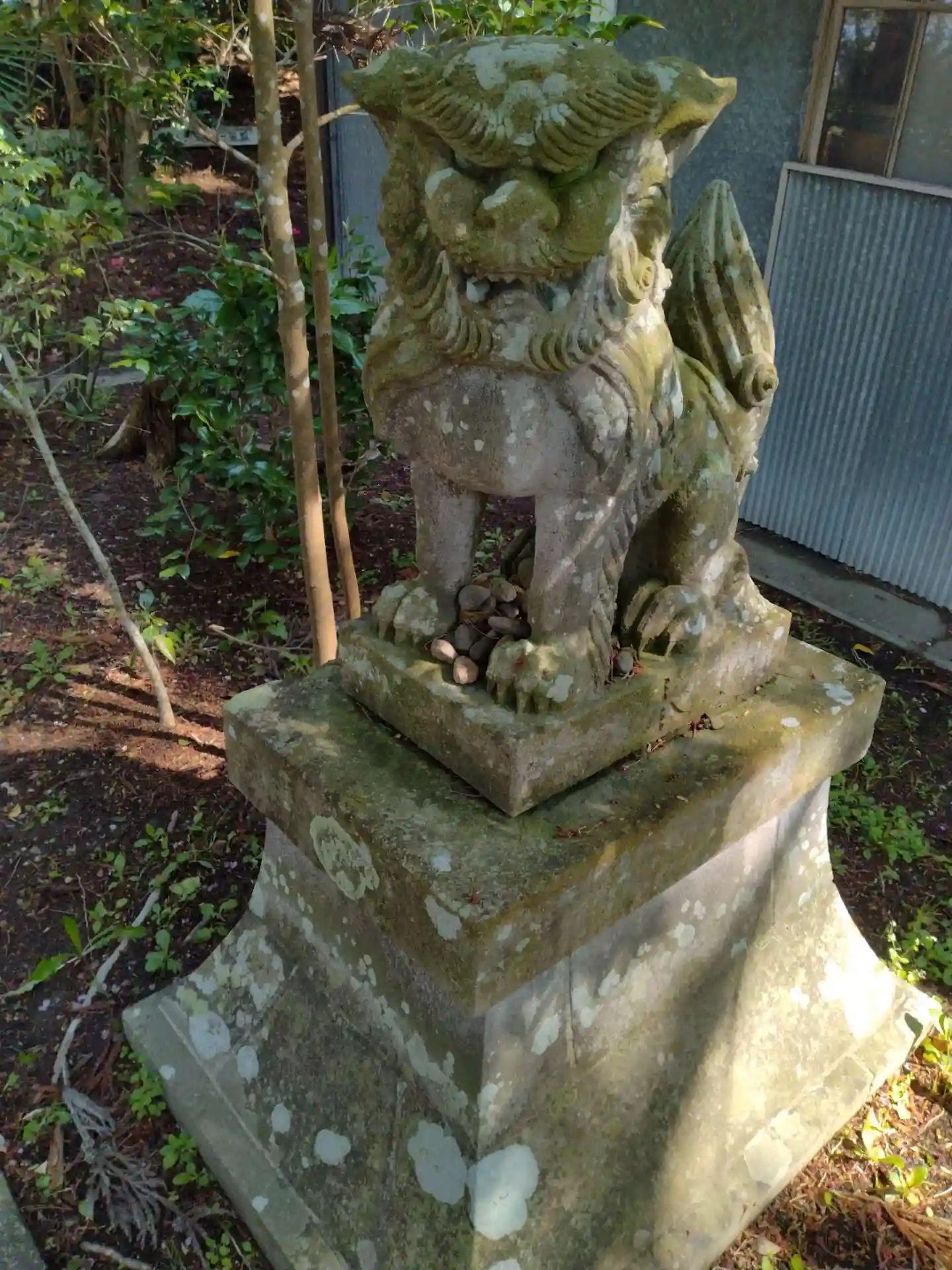 神明社(西館)鳥居から参道を歩くと境内に鎮座する(吽形の狛犬さん)の様子です