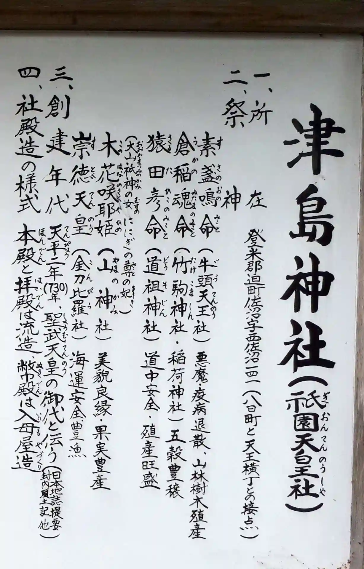 | ご祭神 | 本殿 神武速素盞鳴尊、倉稲魂命、猿田彦命、木花咲耶姫命