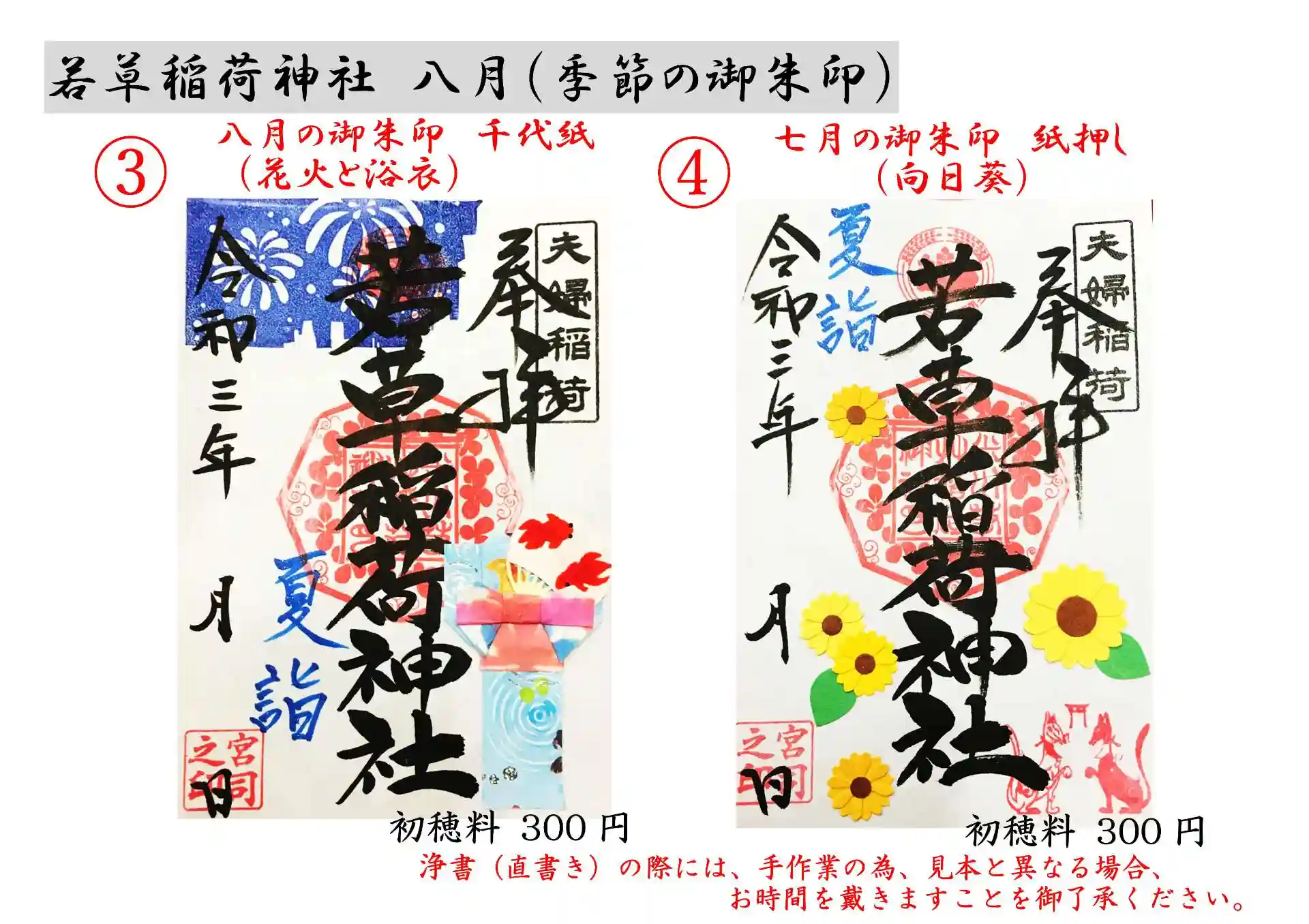 若草稲荷神社【八月季の御朱印:(1)水風船、(2)楓と錦鯉、(3)花火と浴衣、(4)向日葵】御朱印帳への浄書(直書き)を行わせて頂きます。