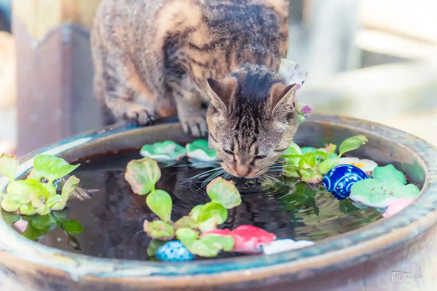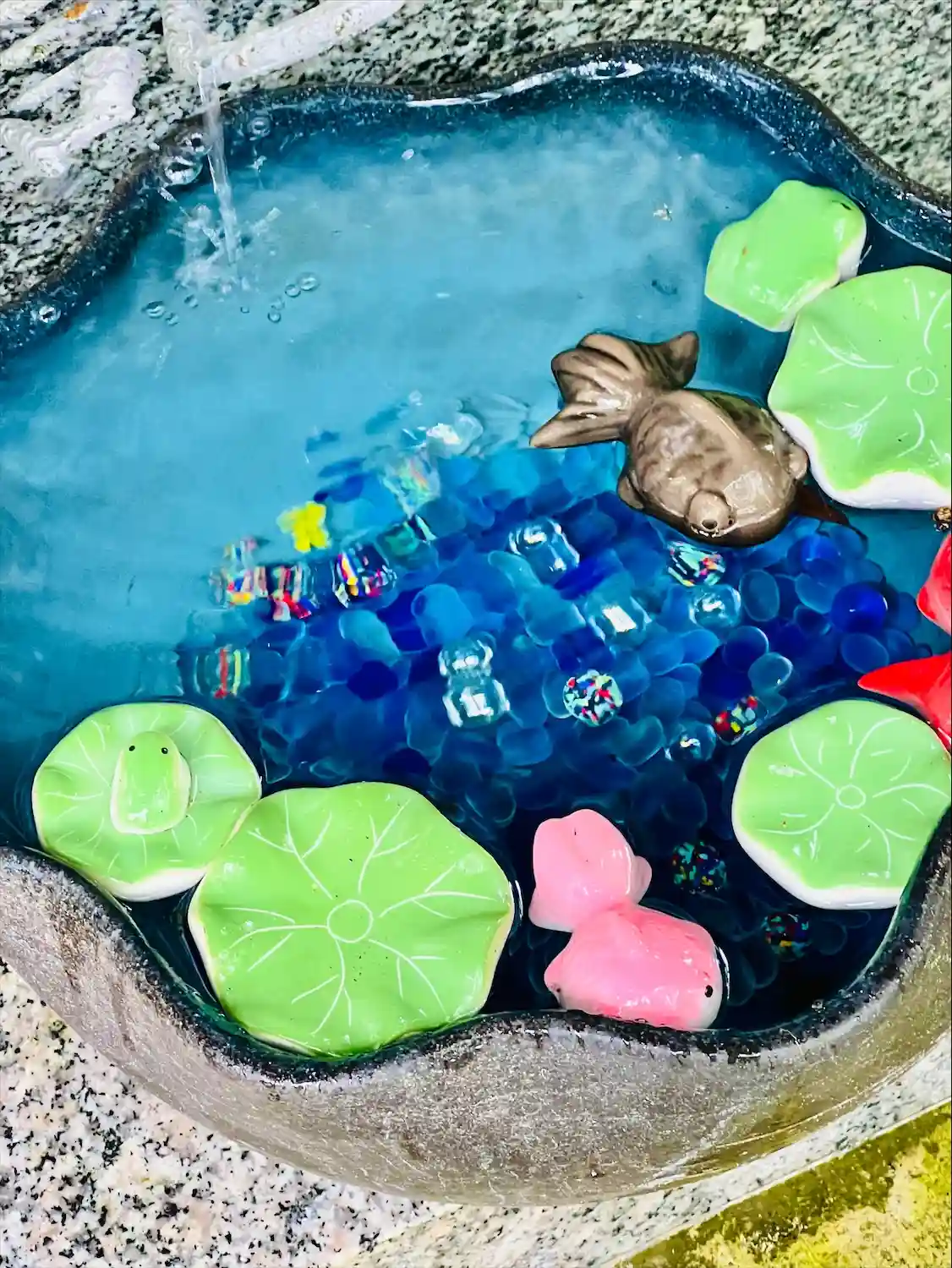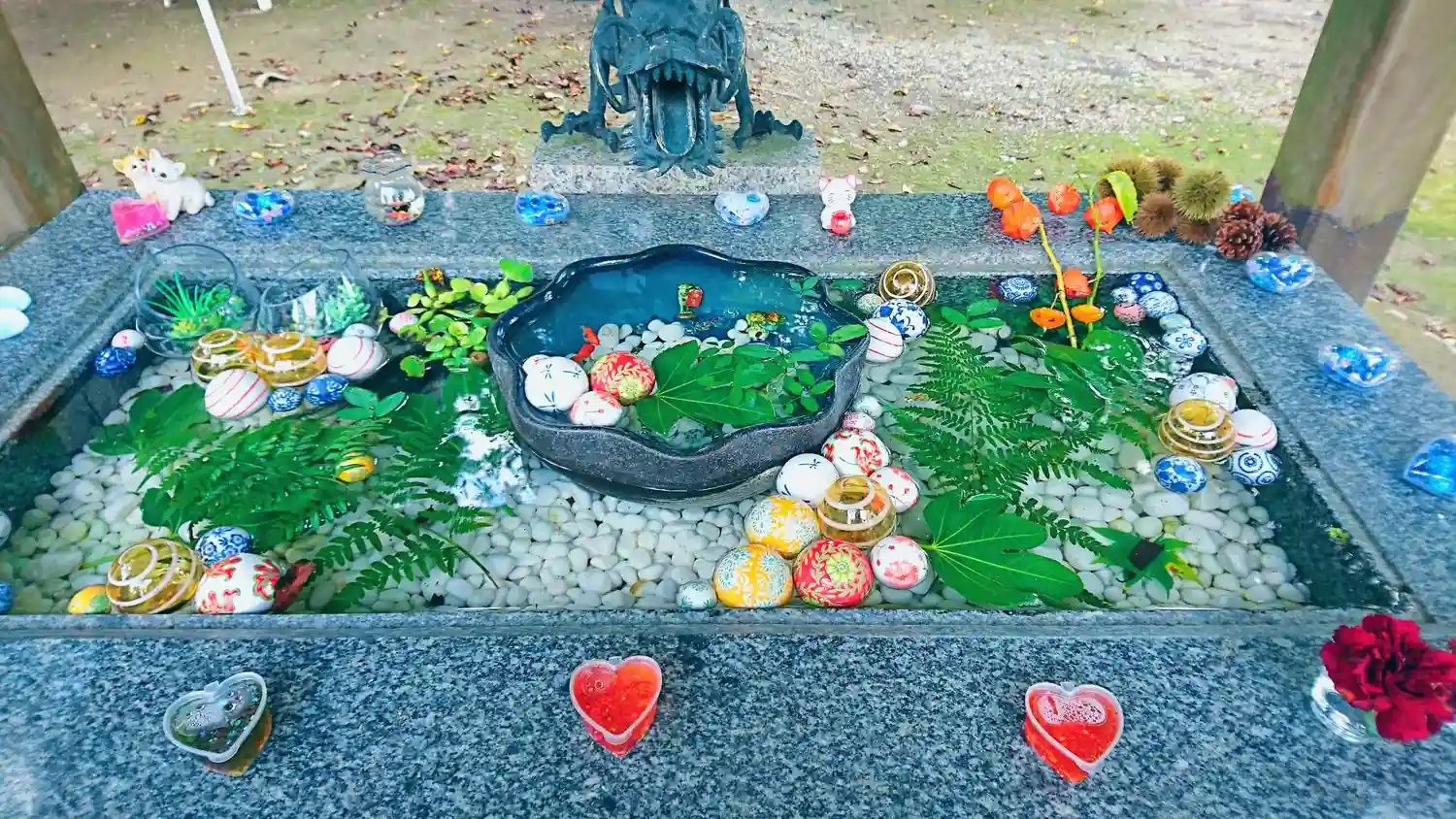 手水舎でピョン吉を発見したので水をかけてみたら、近付いてカメラ目線をしてくれた!🐸笑