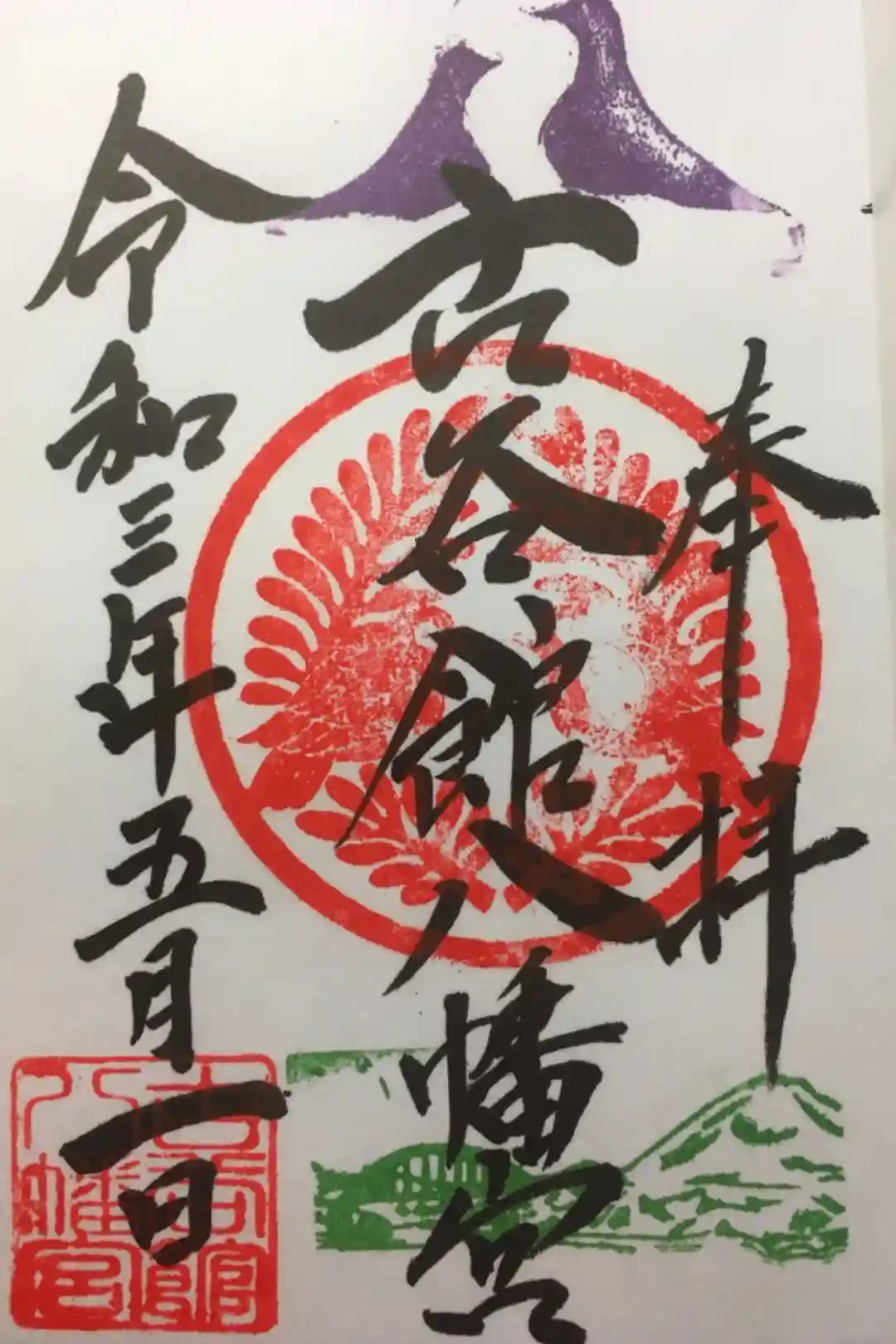 紫「対(むか)い鳩」:全国の八幡神社では鳩は神の使いとされています。向い合う鳩の口はそれぞれ「阿」と「吽」となっています。