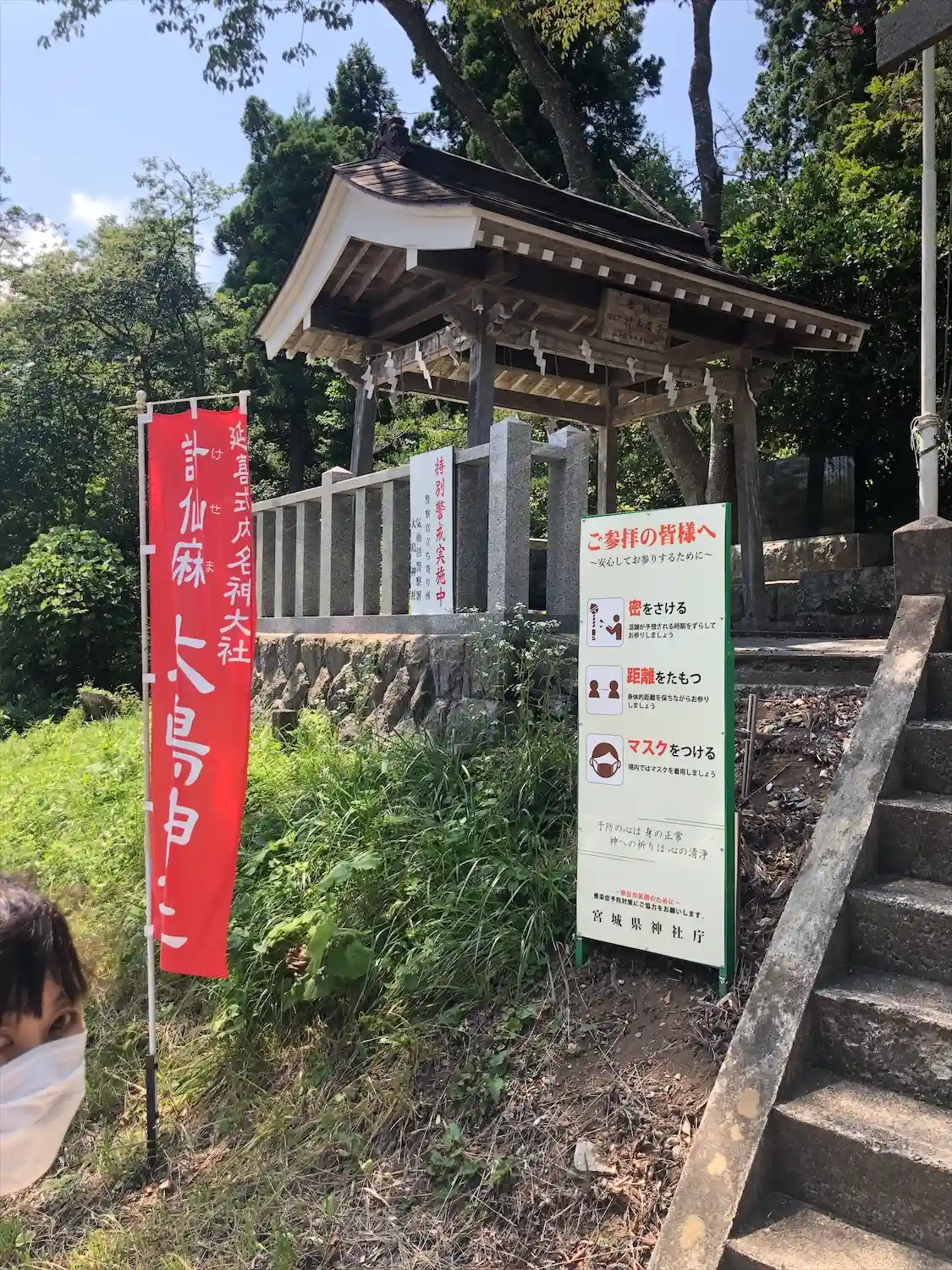 「おかえりモネ」のスタンプラリーをしているそうです。自撮り用の台があり、境内をバックに写真が撮れるようになっていました。