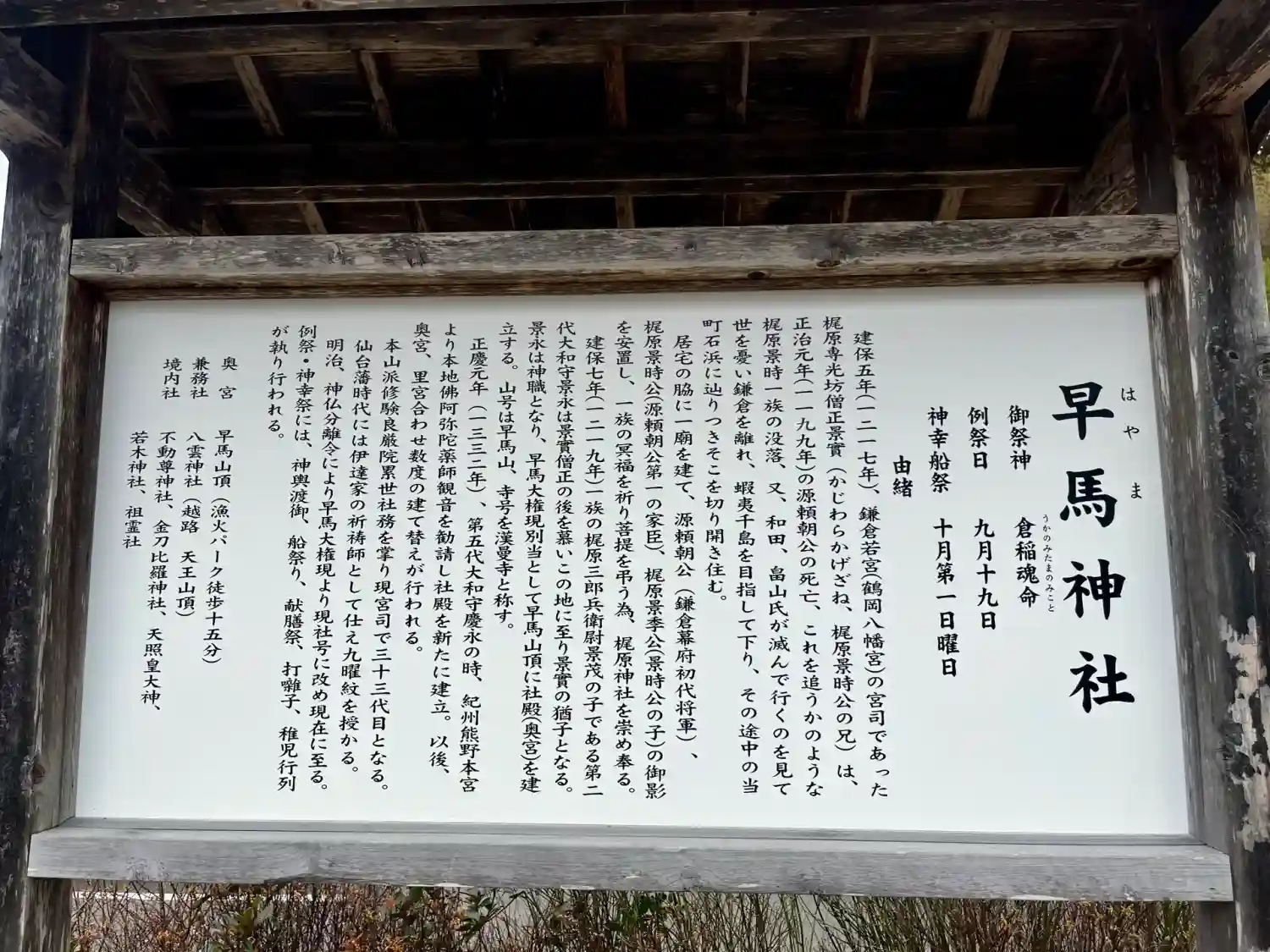 弟の景時が幕府内で権力闘争に巻き込まれていく一方で、兄の景実はこの地で早馬神社を創建し、代々宮司を務めることとなります(現在の宮司様は33代)これにより、早馬神社は鎌倉幕府黎明期の歴史を今に伝える貴重な存在となっています。