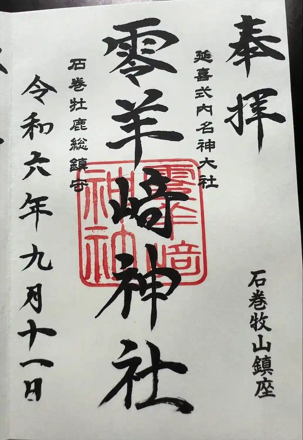 零羊崎神社 祭務所にて書き置き御朱印頂戴いたしました